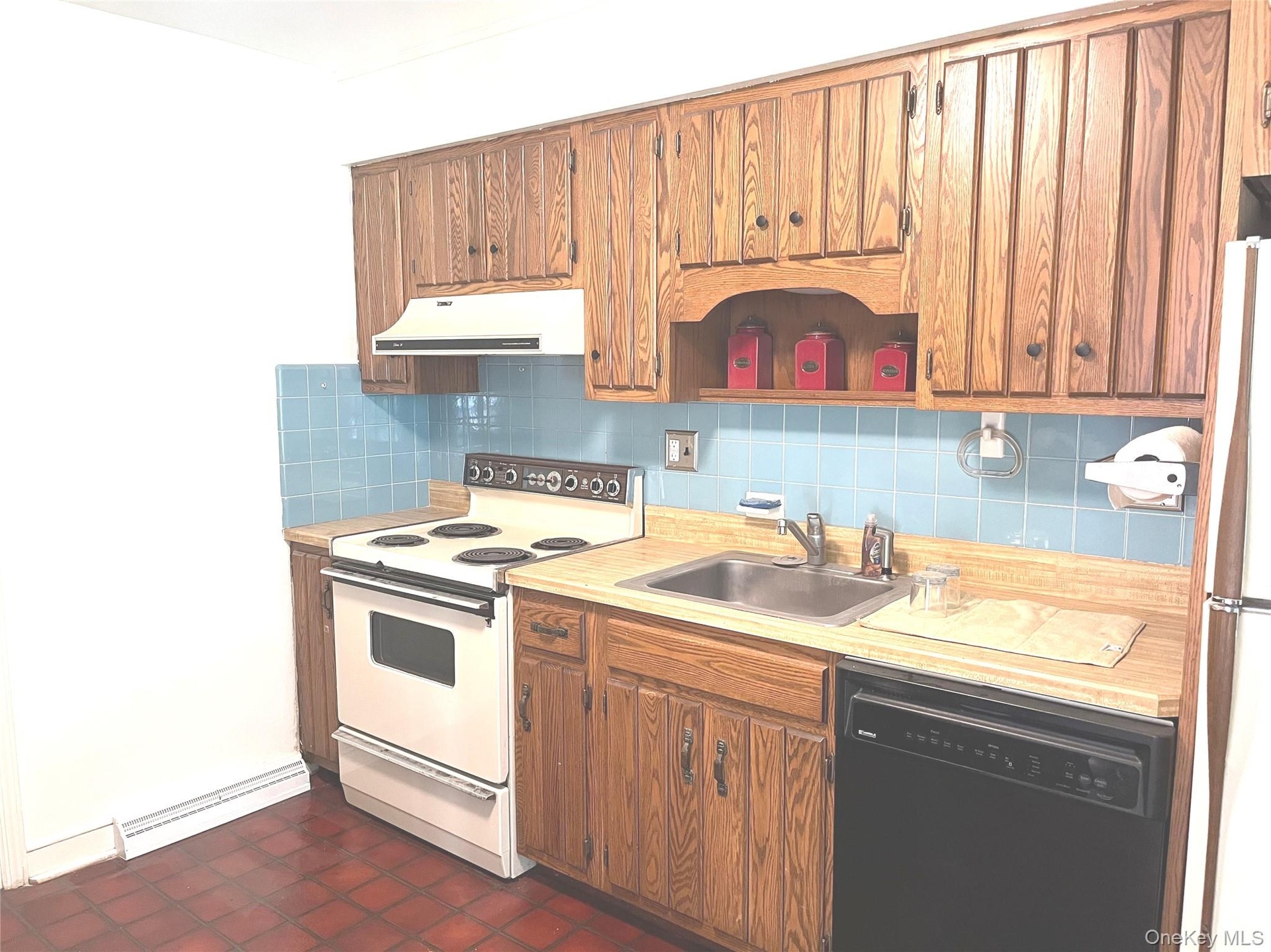 - Kitchen with white appliances, backsplash, light countertops, and range hood