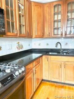 - Kitchen with appliances with stainless steel finishes, dark countertops, glass insert cabinets, tasteful backsplash, and light wood-style flooring