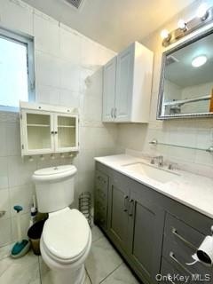 - Bathroom featuring tile walls, backsplash, and vanity