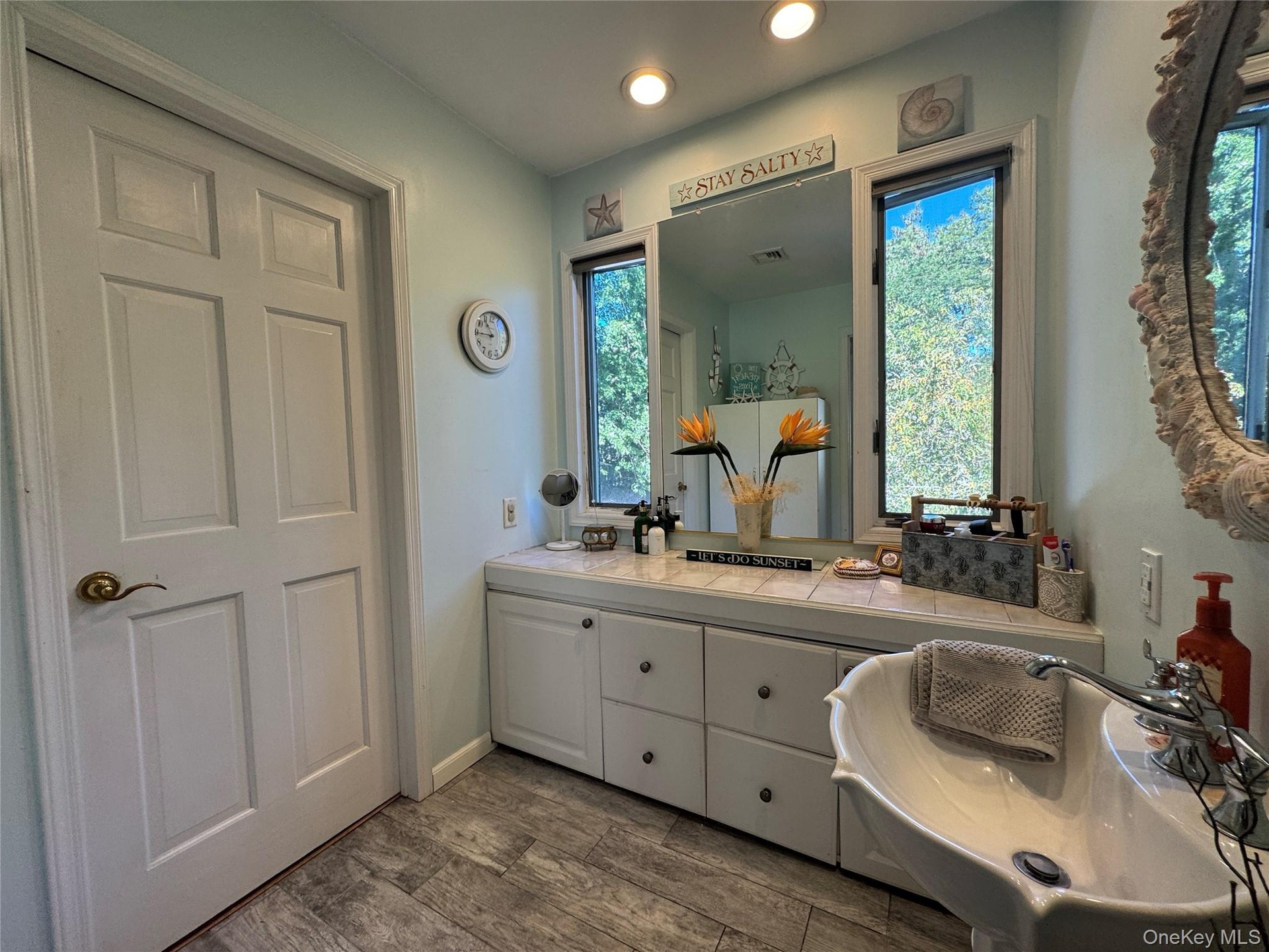 - Bathroom featuring vaulted ceiling, a skylight, a garden tub, wood finished floors, and vanity