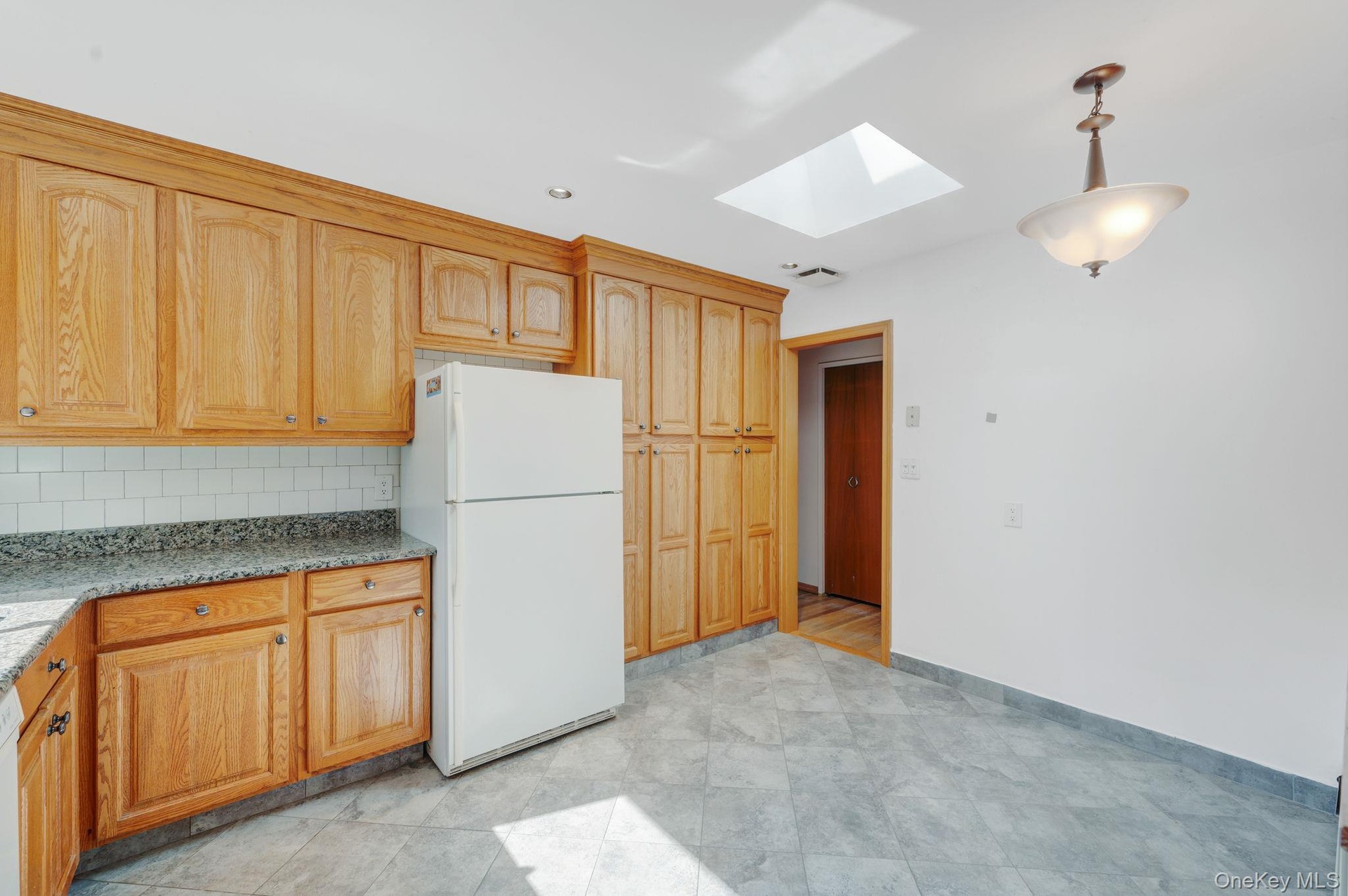 - Kitchen with a skylight, light stone counters, freestanding refrigerator, backsplash, and hanging light fixtures