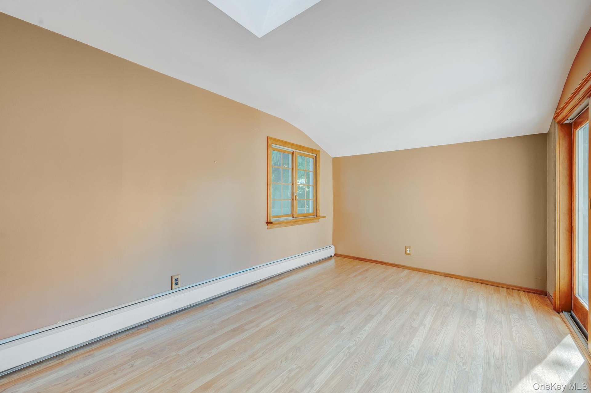 - Spare room with a baseboard heating unit, a skylight, light wood-style floors, and vaulted ceiling