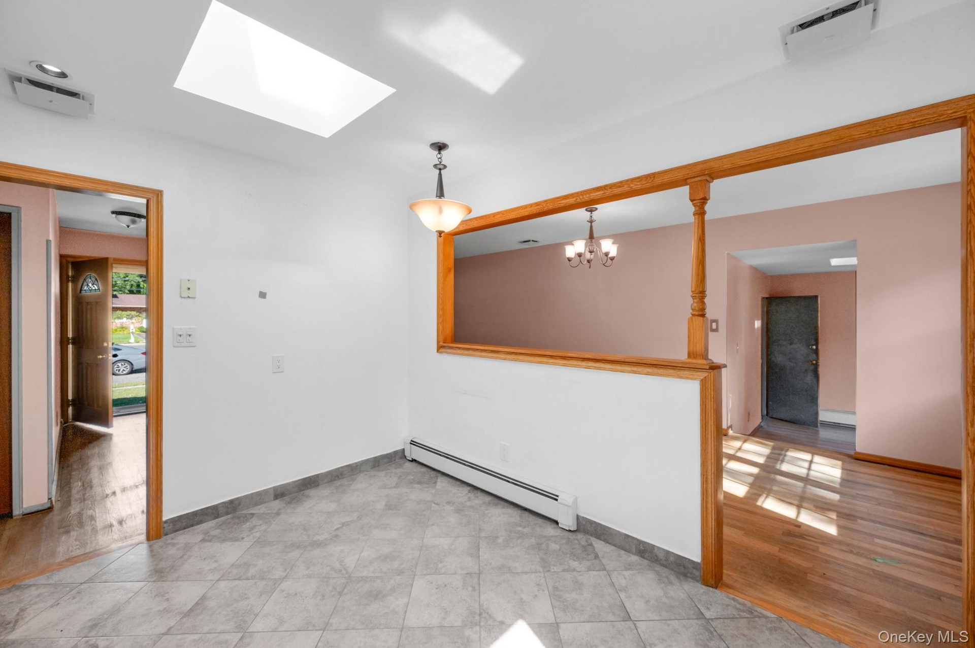 - Spare room featuring a skylight, a baseboard radiator, a chandelier, and light tile patterned flooring