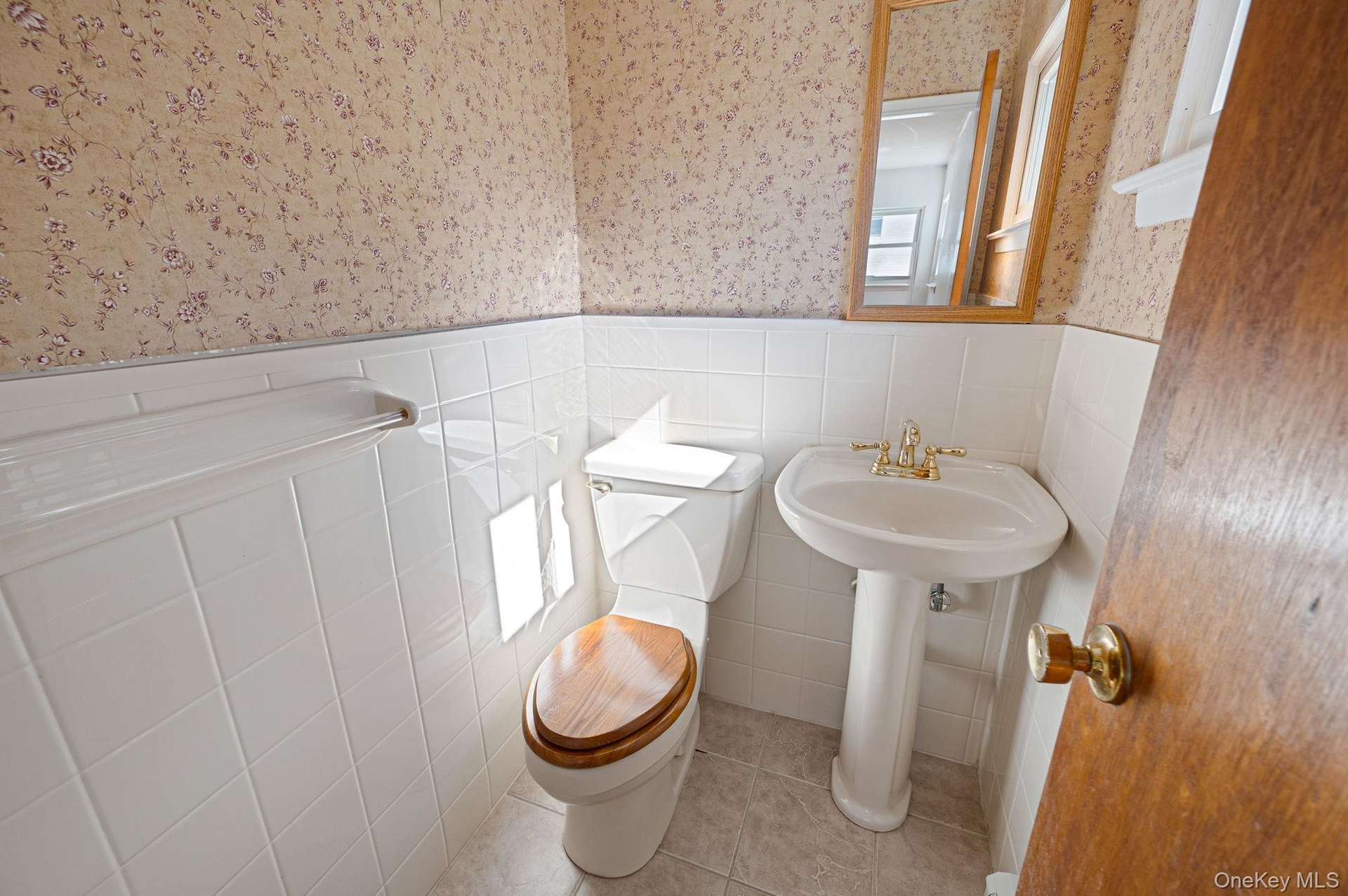 - Bathroom with wallpapered walls, tile patterned flooring, a wainscoted wall, and tile walls