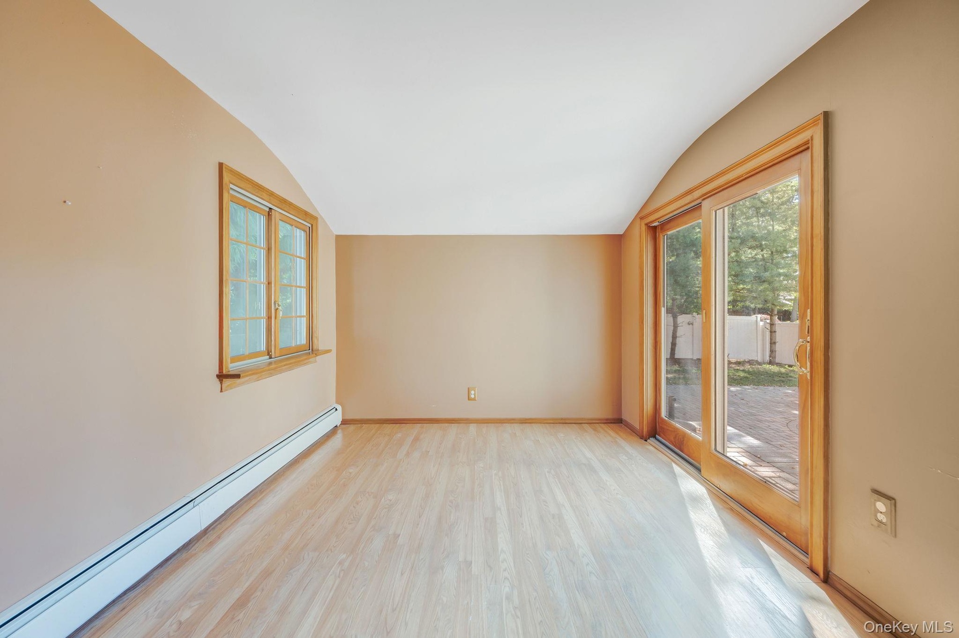 - Spare room with hardwood / wood-style flooring, a baseboard radiator, plenty of natural light, and lofted ceiling