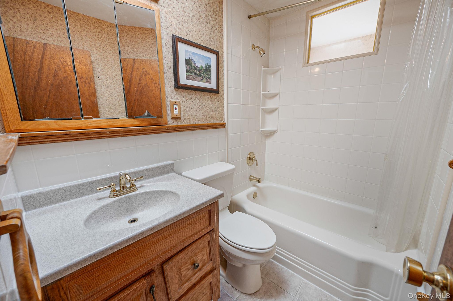 - Full bath with shower / bath combo with shower curtain, vanity, wallpapered walls, tile walls, and light tile patterned floors