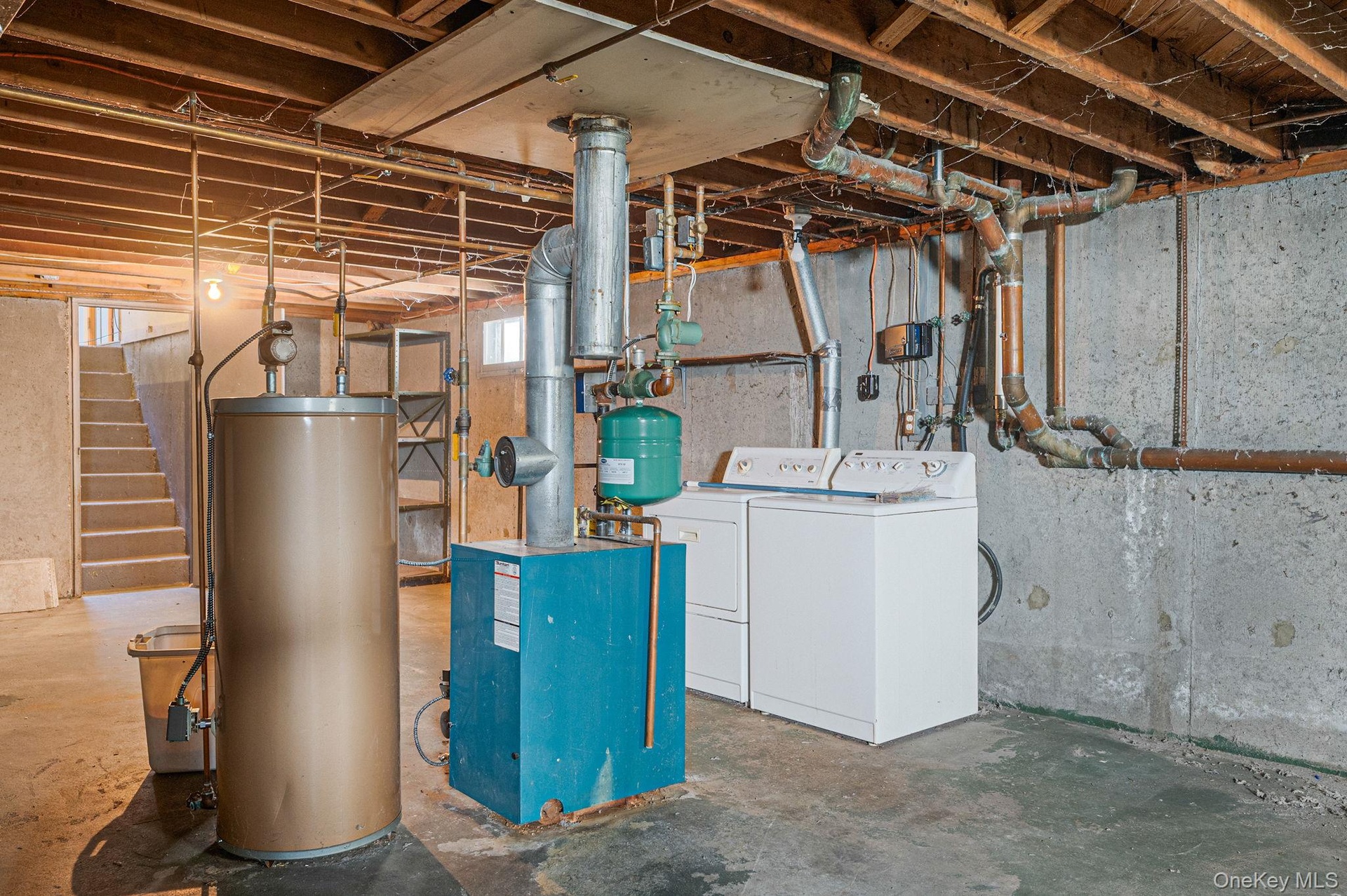 - Unfinished below grade area with oil tank, a heating unit, water heater, and washer and clothes dryer