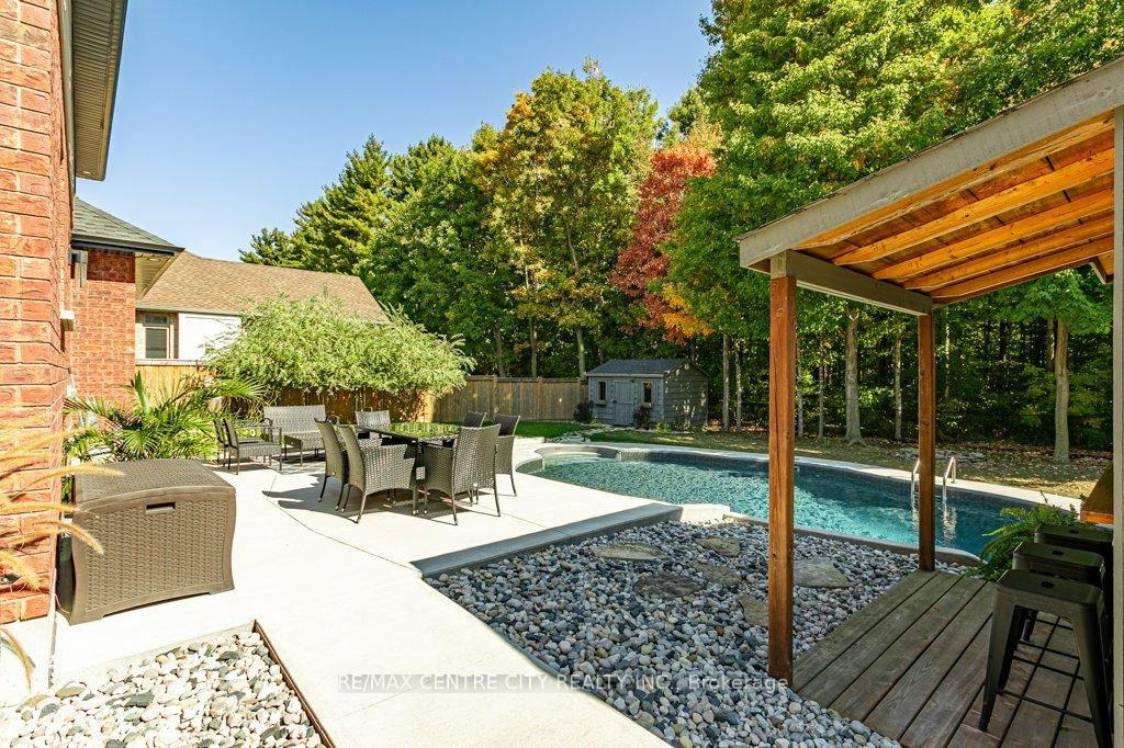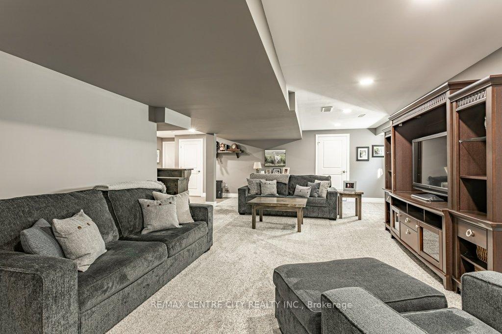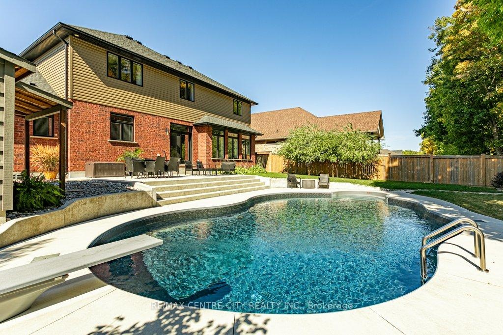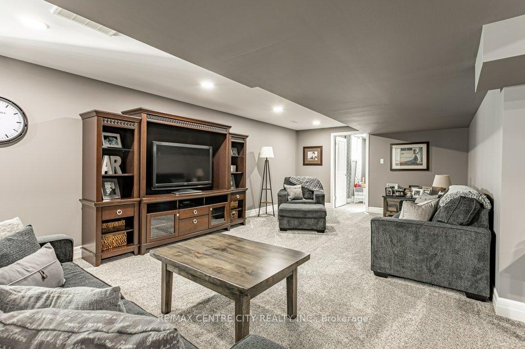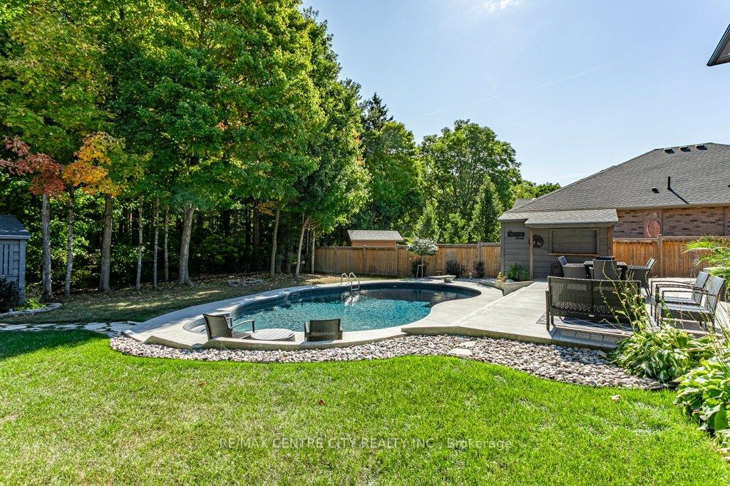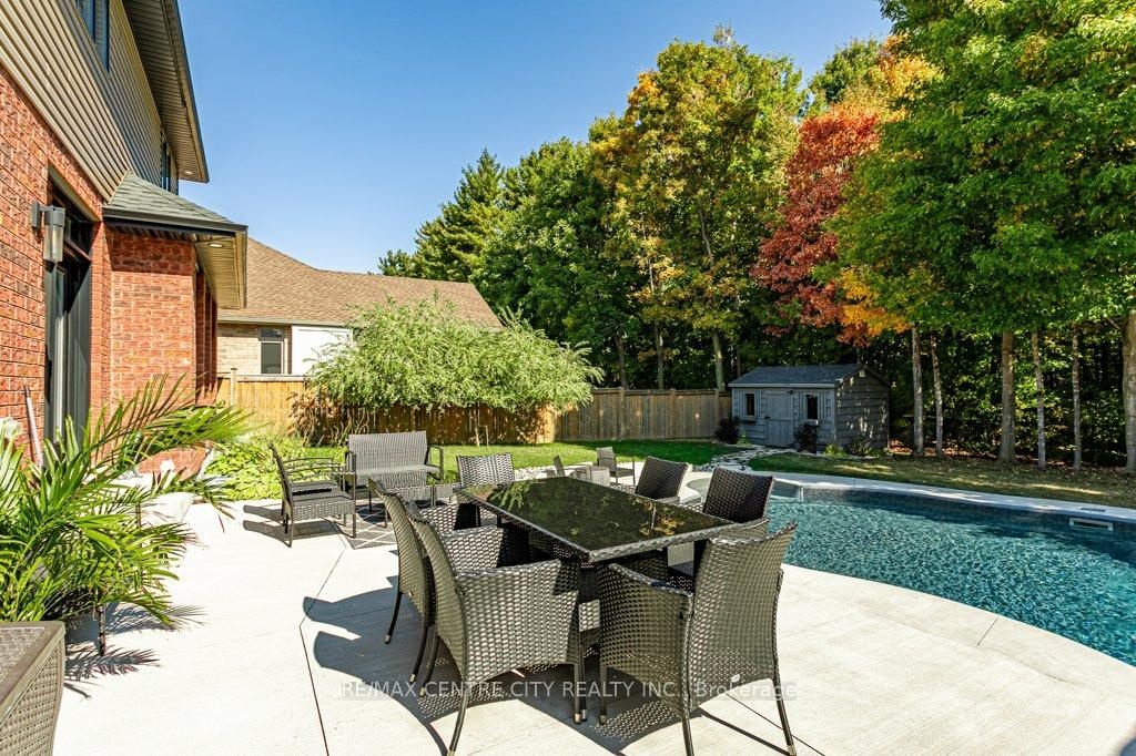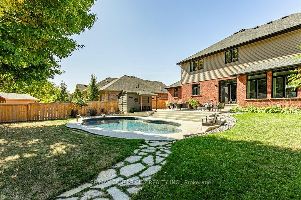 148 Elliott Trail, a stunning red-brick home located in the desirable Trails of Wye Creek neighbourhood in Thorndale, Ontario. This inviting 4 bed, 4 bath home boasts over 4000 sq. feet with a 3 car garage, perfect for those with multiple vehicles. Prepare to be captivated by the large family room, boasting a cozy gas fireplace and beautiful views through expansive windows that overlook your personal backyard paradise. The open-concept layout effortlessly blends socializing and functionality with the well-appointed kitchen, complete with ample storage, large counter space, and a convenient eat-in island. The main floor conveniently accommodates a laundry area. Upstairs, three out of the four bedrooms offer spacious walk-in closets, while the fourth bedroom features a charming alcove perfect for creating a separate workspace. The primary bedroom boasts its very own private 4-piece ensuite. Venture downstairs to discover a fully finished recreational space, complete with an elegant bar area. A finished den offers endless possibilities as a playroom, home gym, or whatever suits your imagination. With the powder room and three additional storage spaces, there's no need to clutter up your 3-car garage with miscellaneous items. Outside, revel in the delights of the fully fenced yard, where you can luxuriate in the allure of the in-ground pool or unwind by the cozy fire pit. For those in need of extra storage or workspace, a handy shed awaits your convenience.