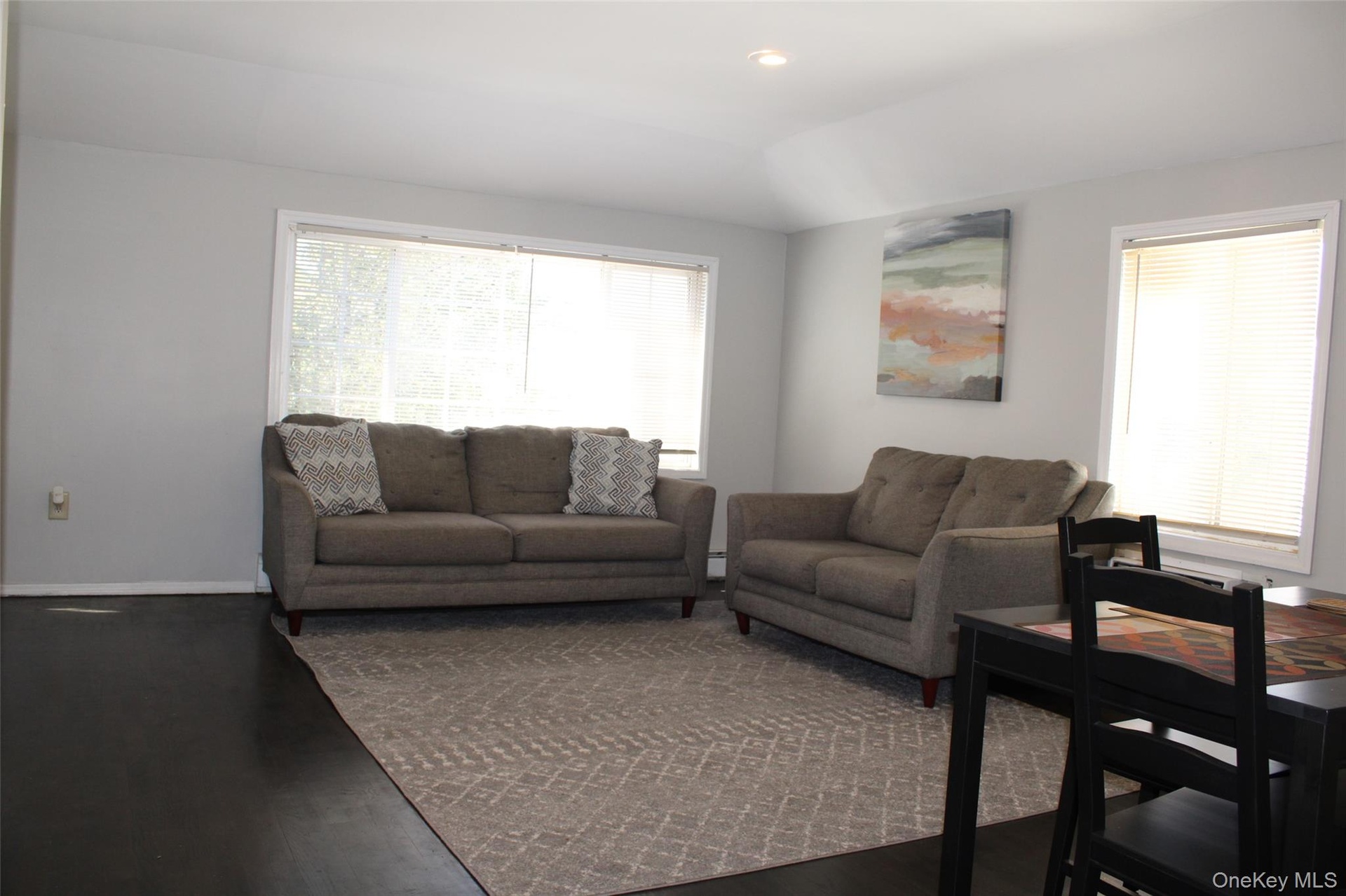 - Living room with dark wood finished floors, recessed lighting, and vaulted ceiling