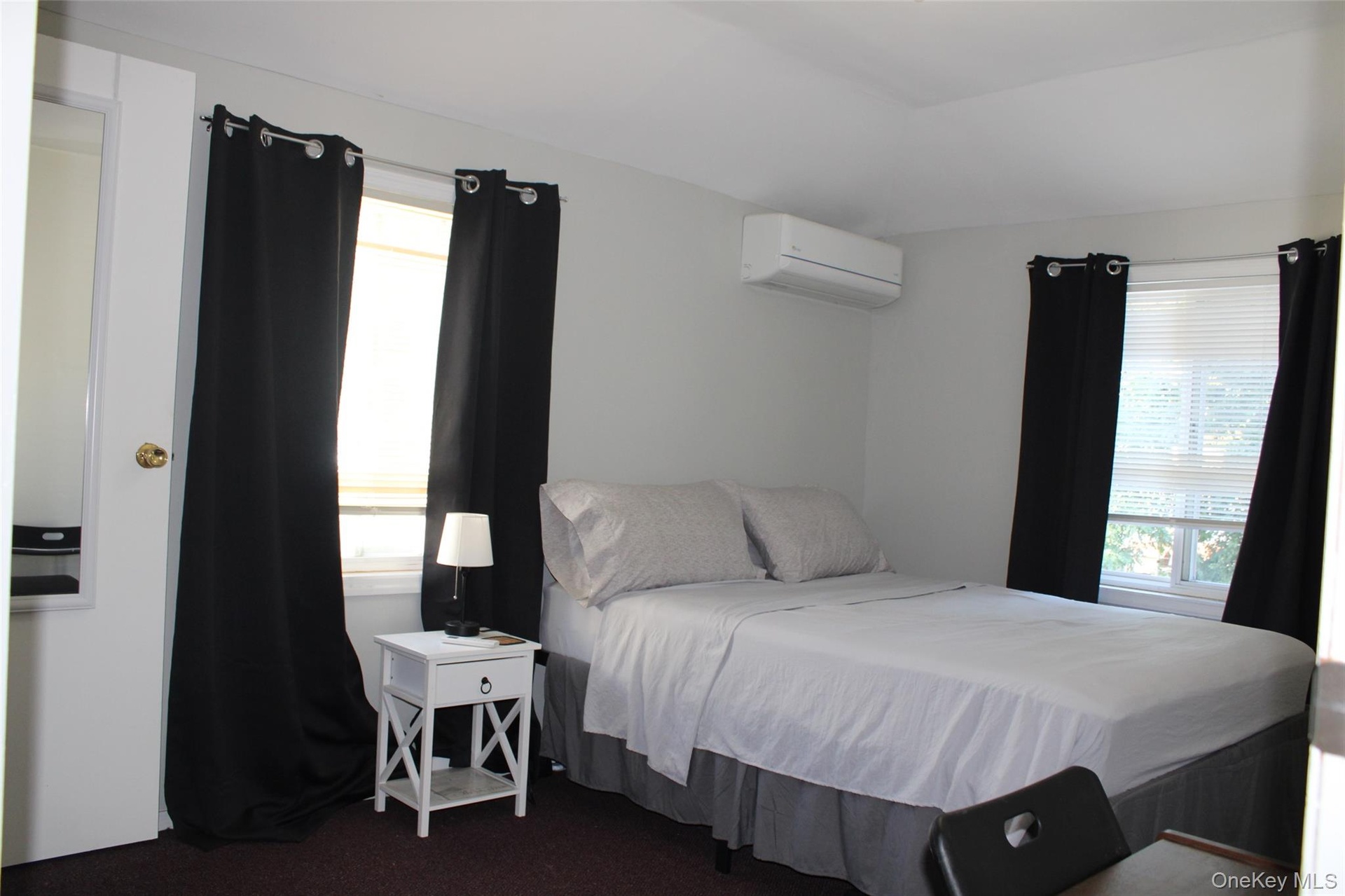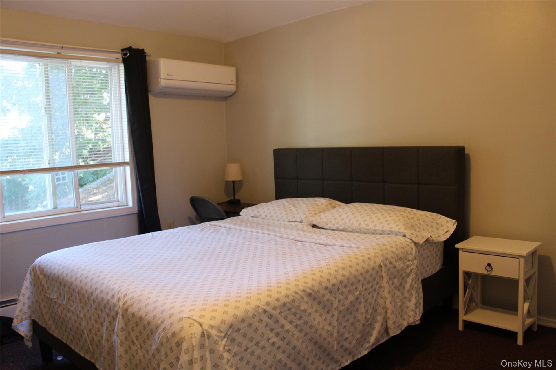 - Bedroom featuring a wall mounted air conditioner, dark carpet, and a baseboard heating unit