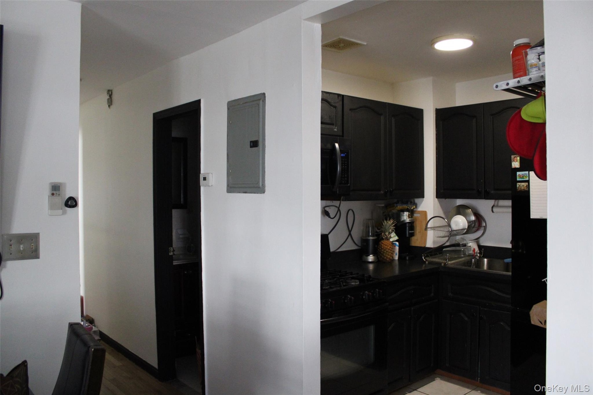 - Kitchen with dark cabinetry, black appliances, and electric panel