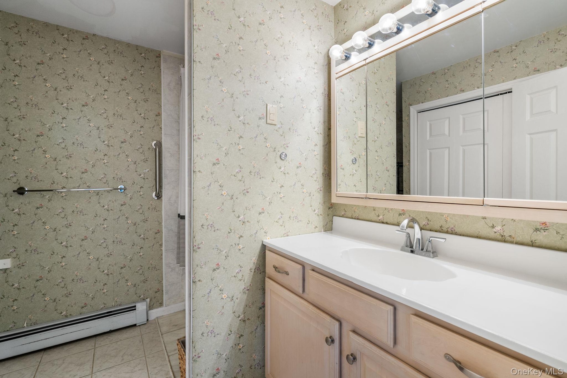 - Full bath featuring vanity, a baseboard heating unit, light tile patterned flooring, wallpapered walls, and a closet