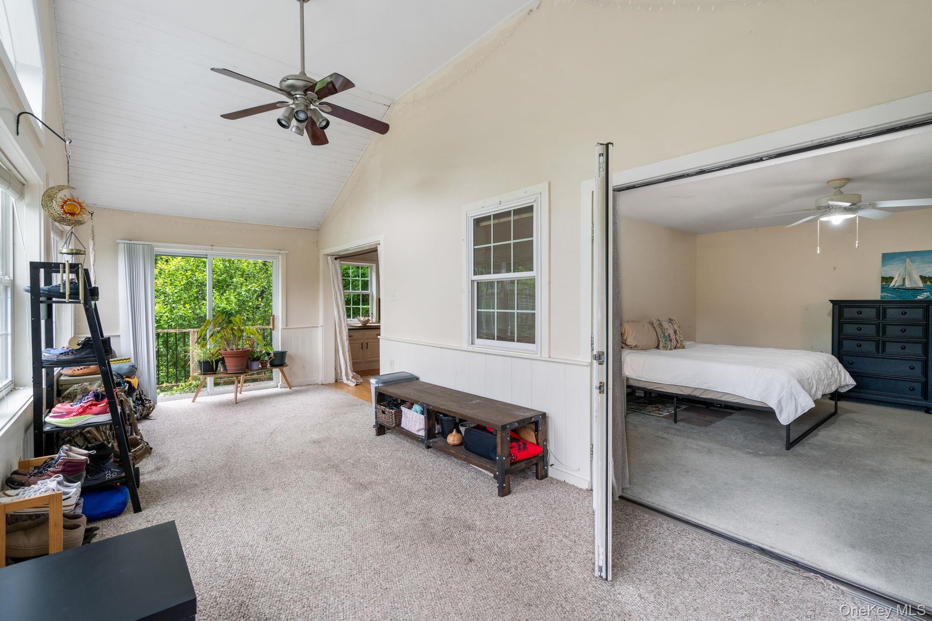 - Sunroom with carpet flooring, plenty of natural light, and high vaulted ceiling
