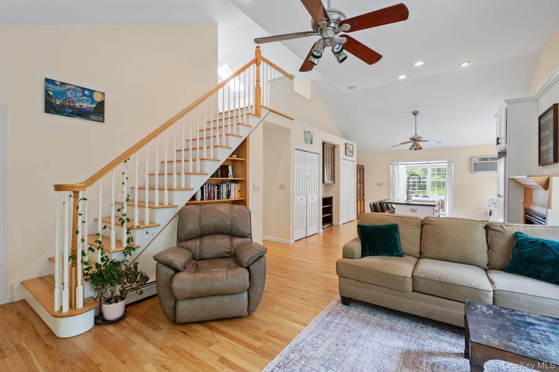 - Living area with high vaulted ceiling, stairway, light wood finished floors, ceiling fan, and recessed lighting