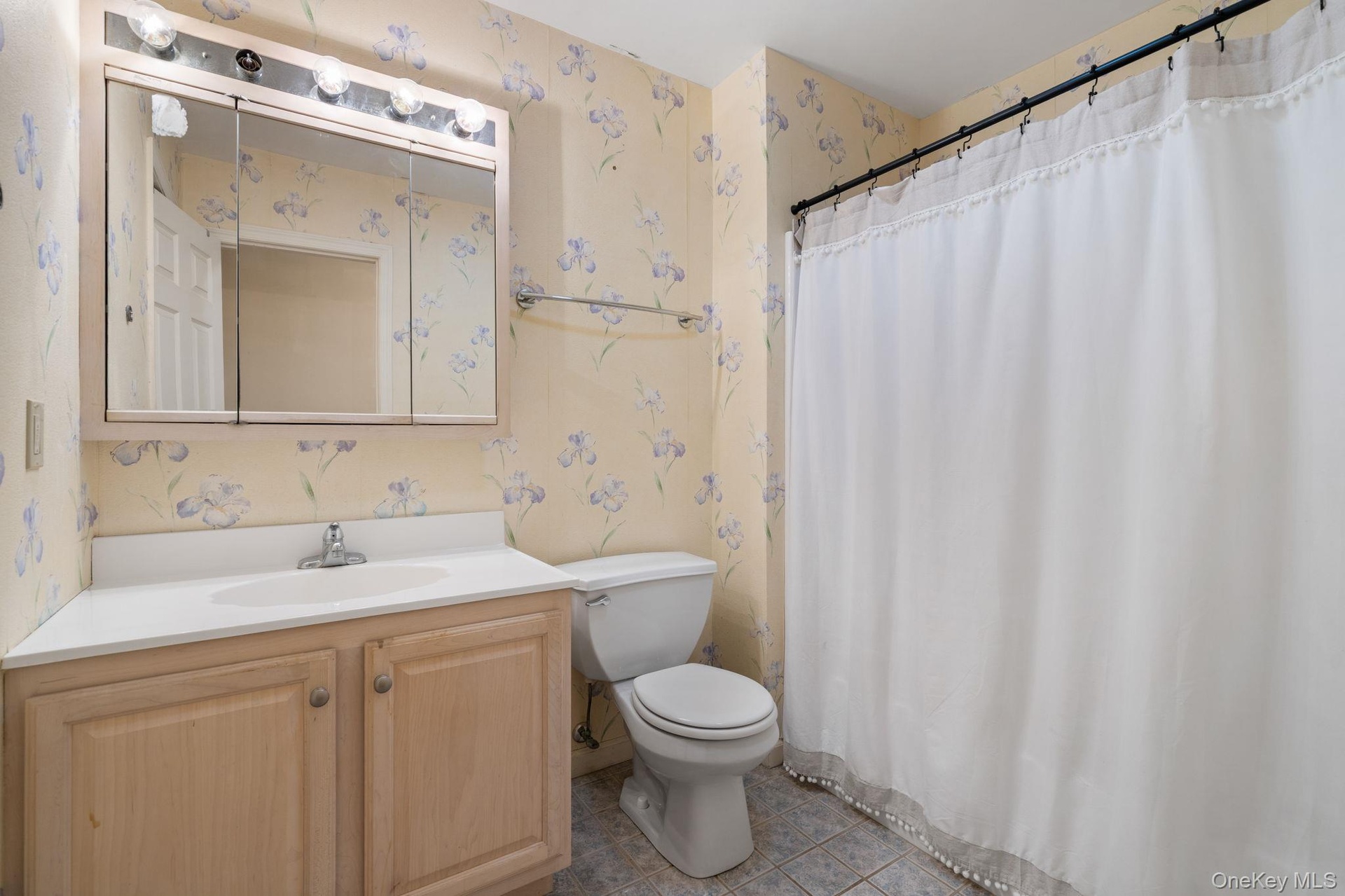 - Full bath with vanity, light tile patterned floors, wallpapered walls, and a shower with shower curtain