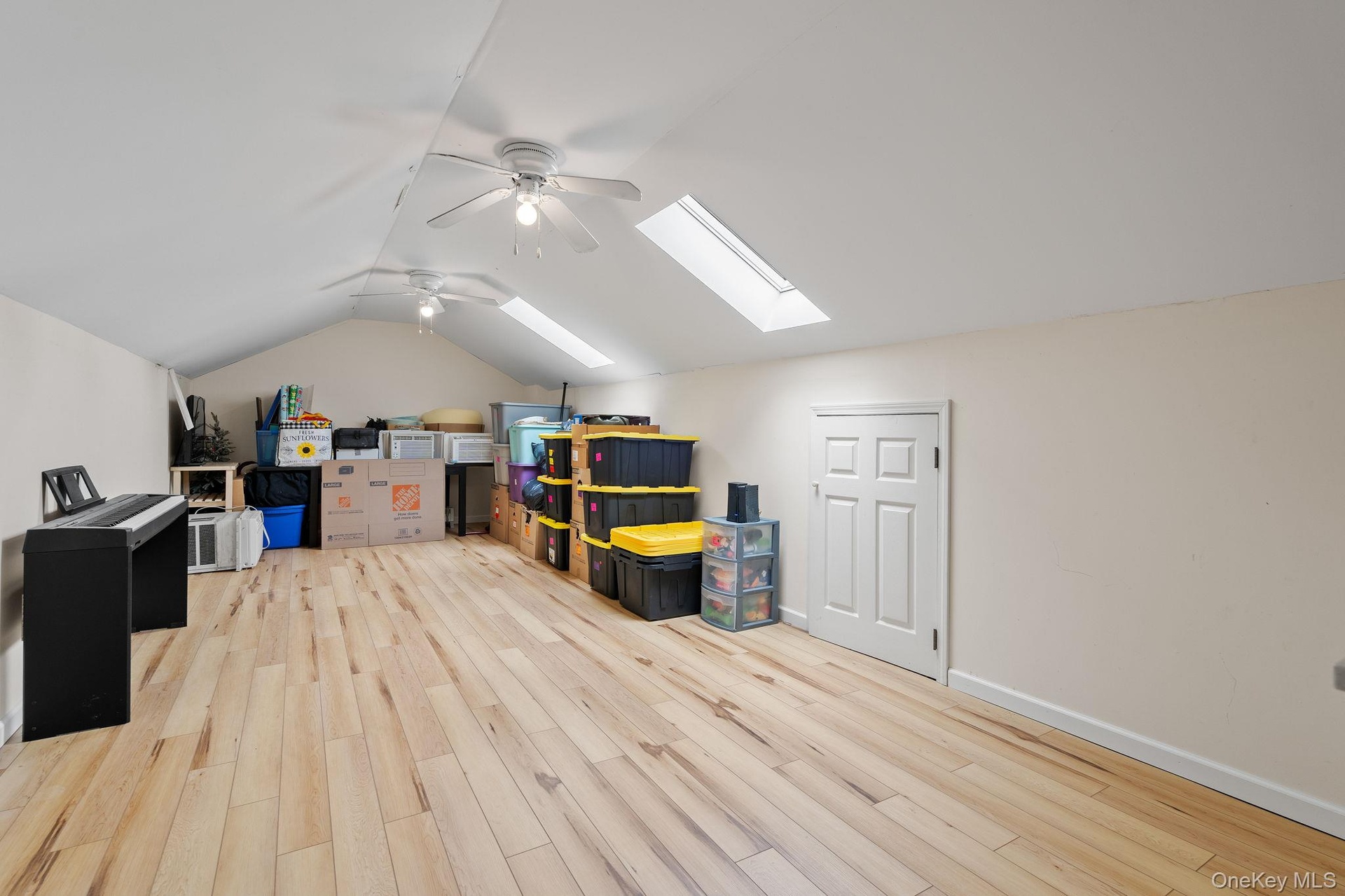 - Bonus room with a skylight, a ceiling fan, lofted ceiling, and light wood-type flooring