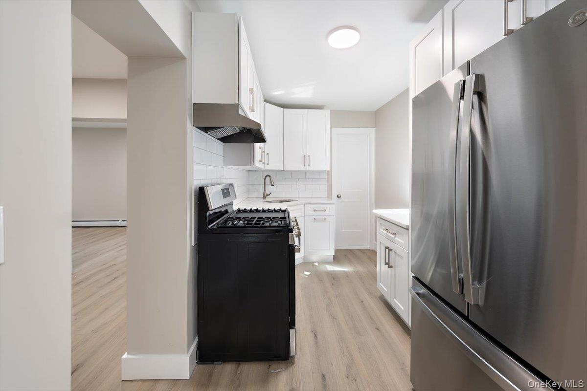 - Kitchen with white cabinets, stainless steel appliances, under cabinet range hood, light stone counters, and light wood-style flooring