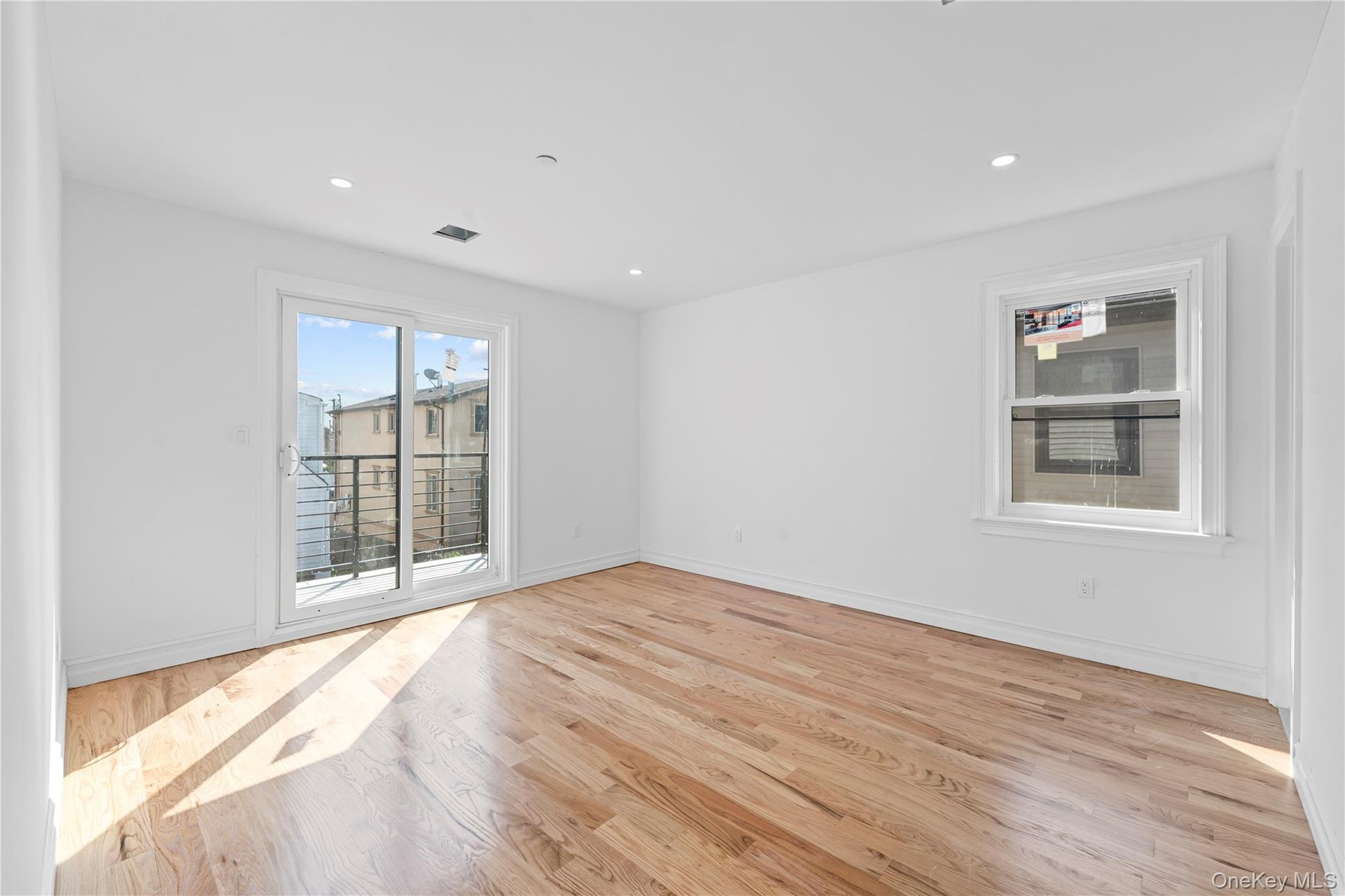 - Unfurnished bedroom with light wood-style flooring, recessed lighting, and ensuite bathroom