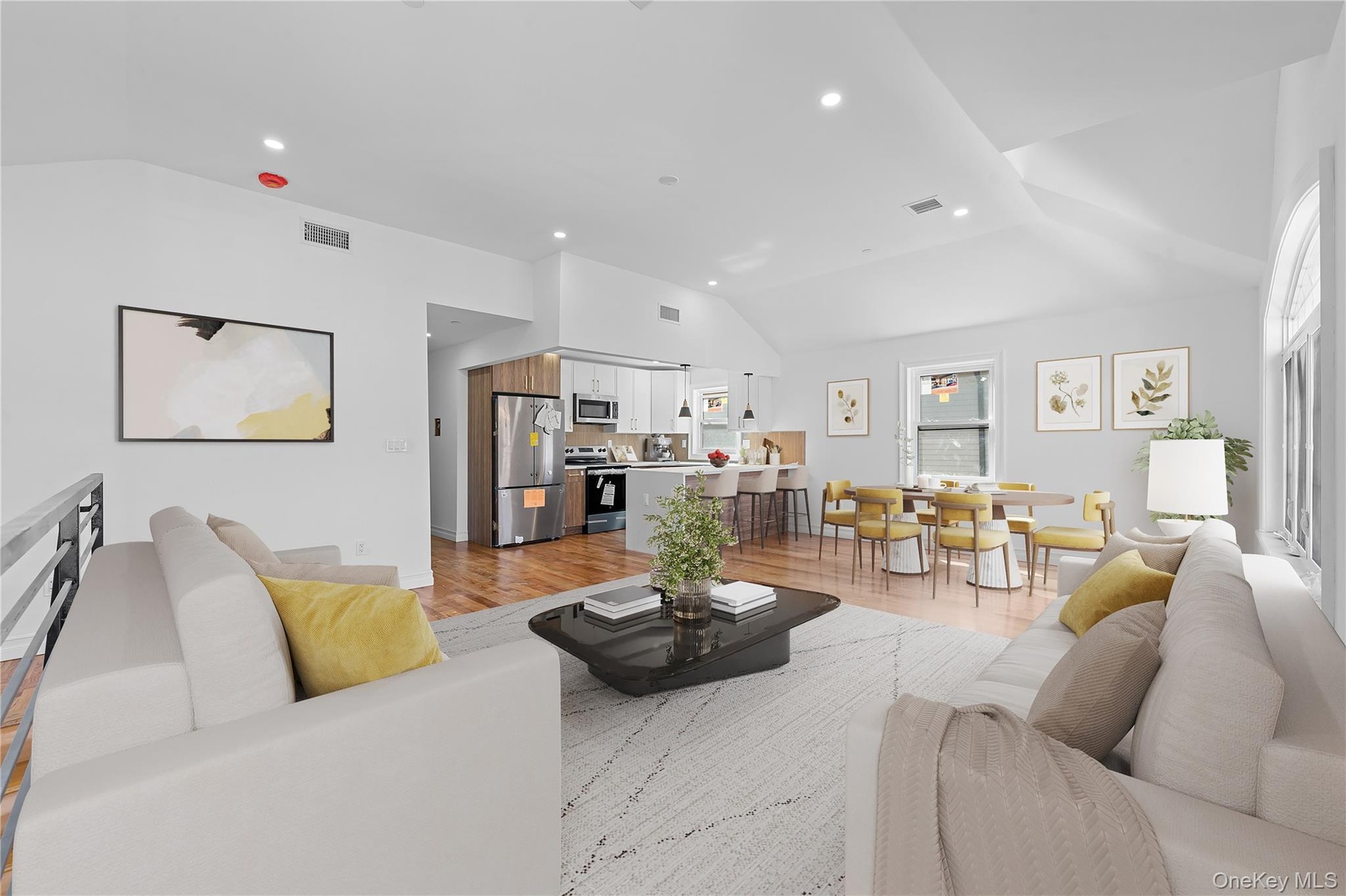 - Living room featuring vaulted ceiling, light wood-style floors, and recessed lighting