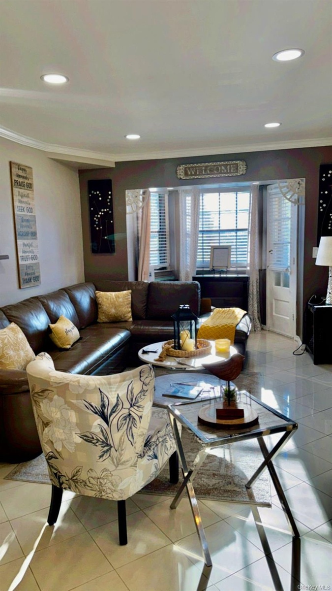 - Living room with ornamental molding, tile patterned flooring, and recessed lighting