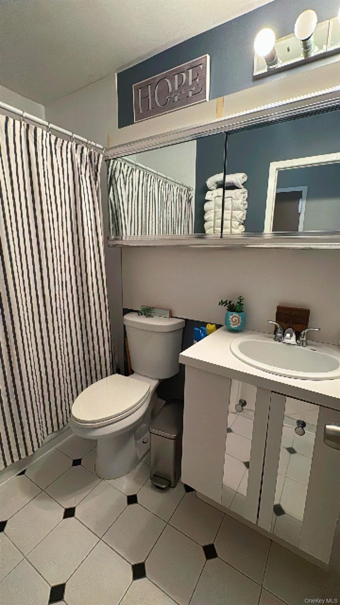 - Full bath featuring vanity, curtained shower, and light tile patterned flooring