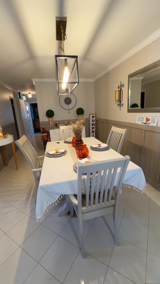 - Dining space featuring crown molding, light tile patterned flooring, and a wainscoted wall