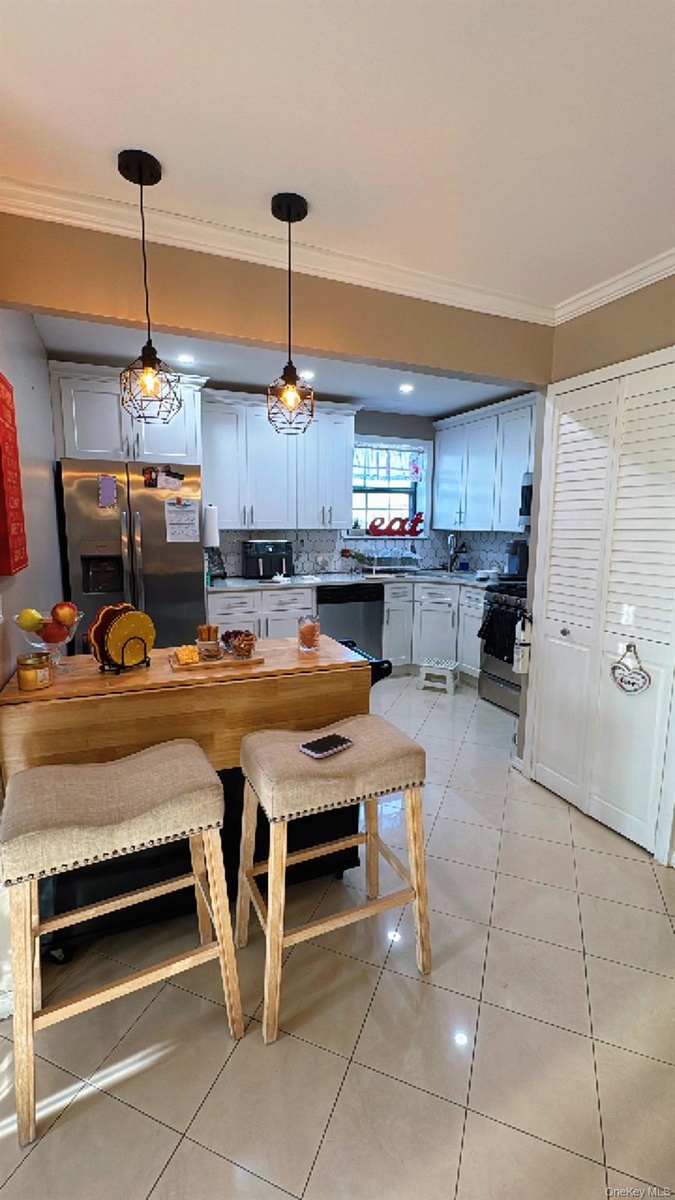 - Kitchen with decorative backsplash, crown molding, appliances with stainless steel finishes, decorative light fixtures, and white cabinetry