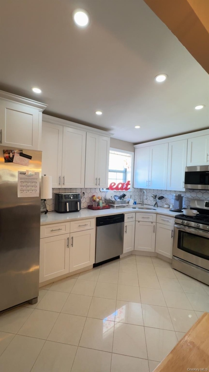 - Kitchen with stainless steel appliances, tasteful backsplash, light tile patterned floors, white cabinets, and recessed lighting