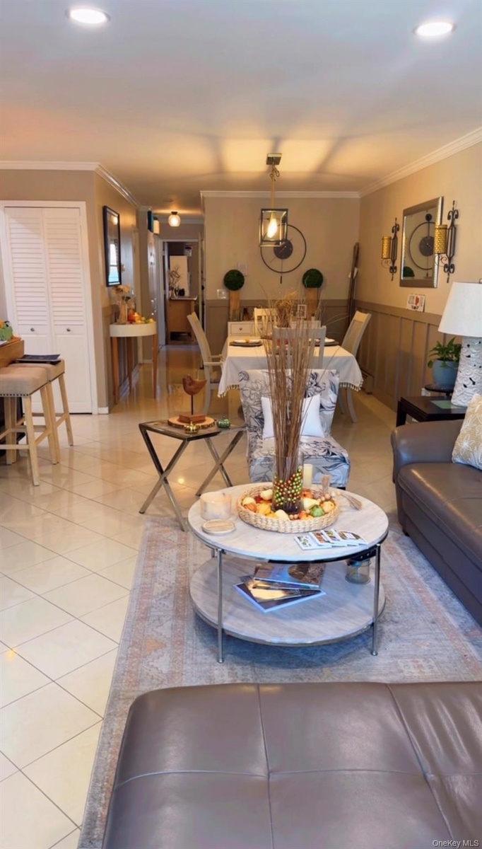 - Living area featuring ornamental molding, recessed lighting, light tile patterned flooring, and a wainscoted wall