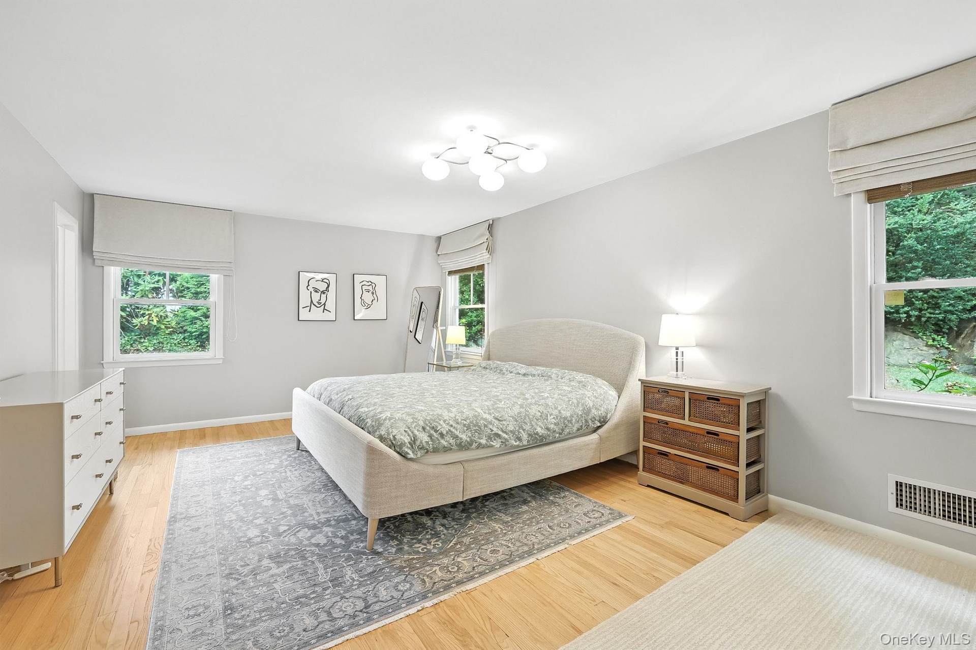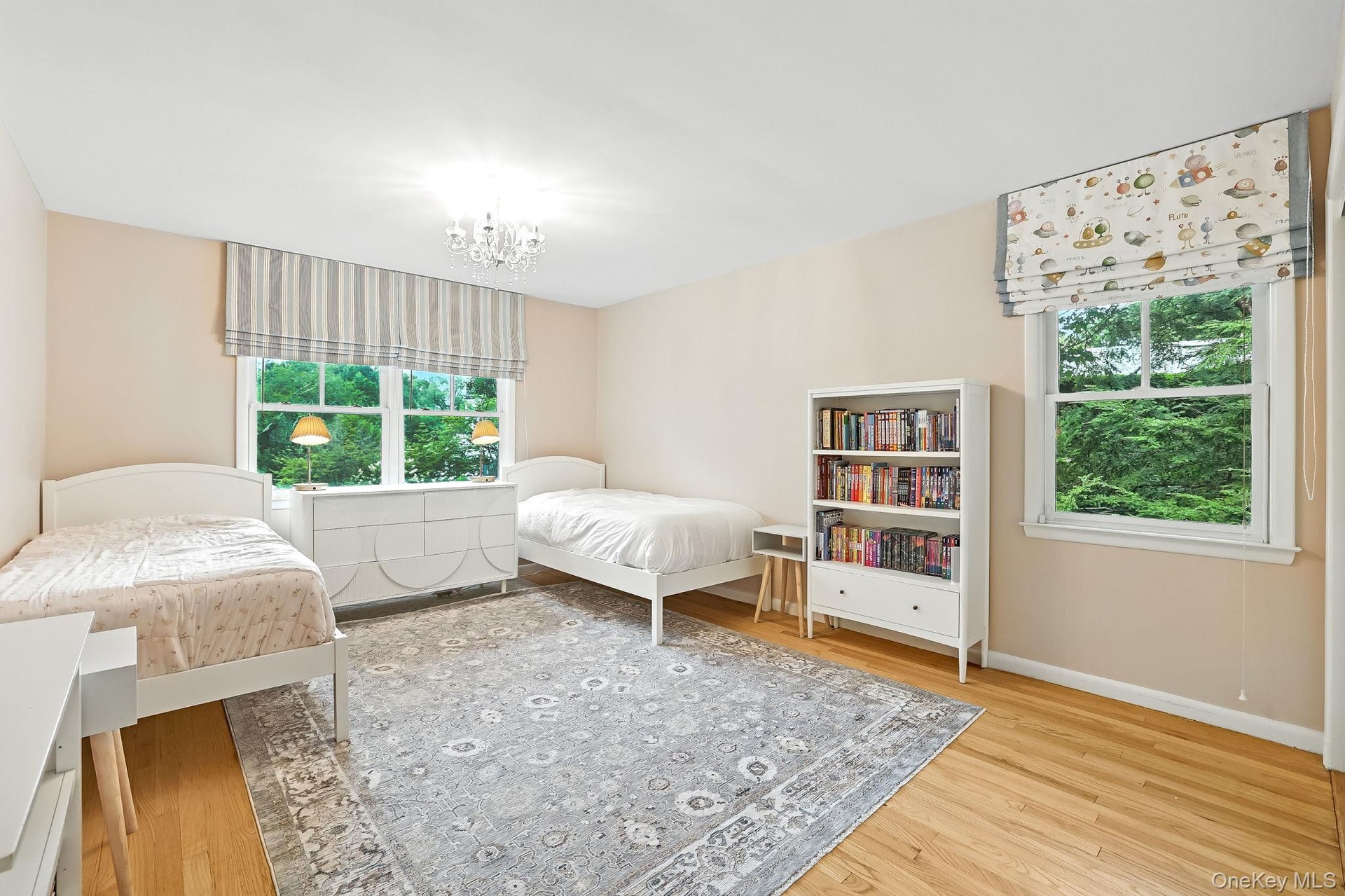 - Bedroom with multiple windows, light wood-type flooring, and a chandelier