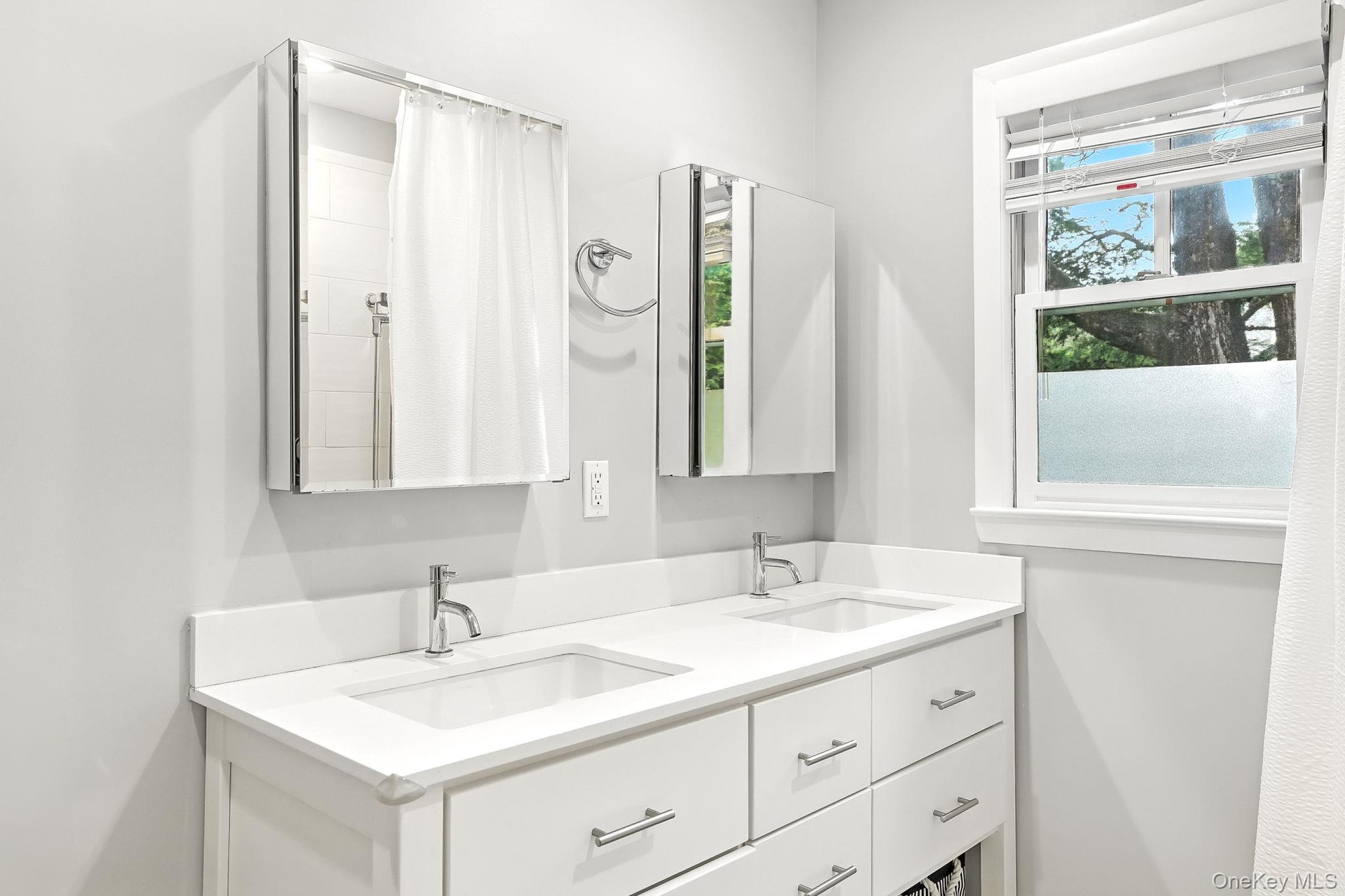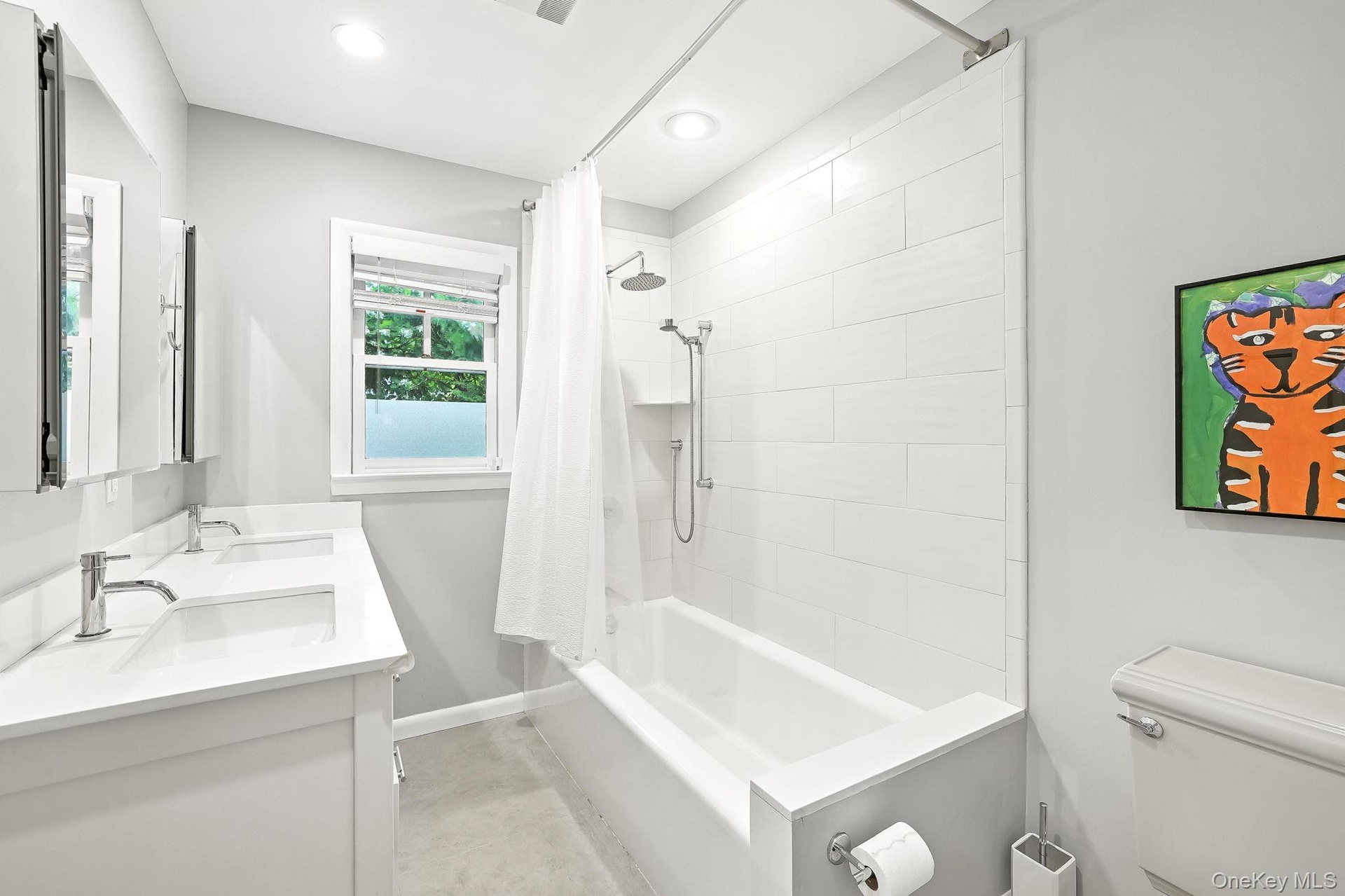 - Full bathroom featuring shower / bath combo with shower curtain and double vanity