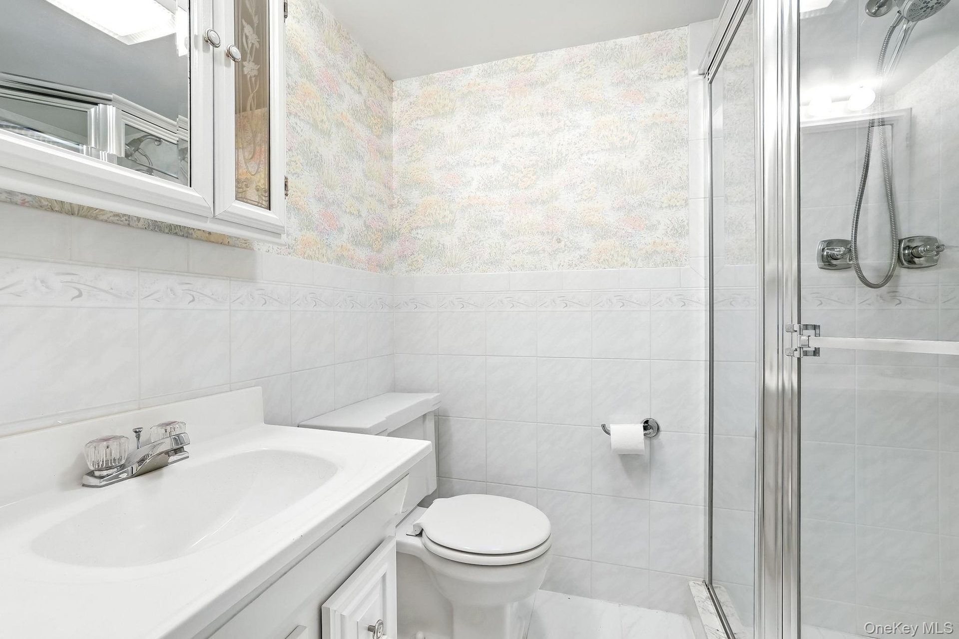 - Full bath featuring a shower stall, vanity, a wall mounted AC, and light marble finish flooring