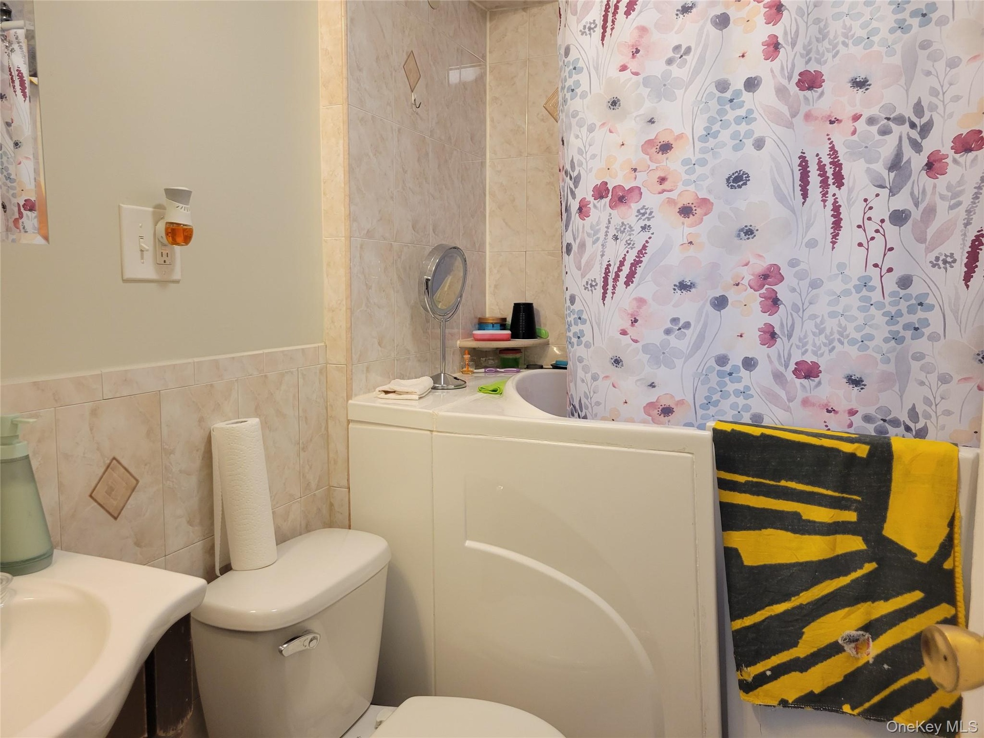 - Bathroom with tile walls, vanity, and shower / bath combo with shower curtain