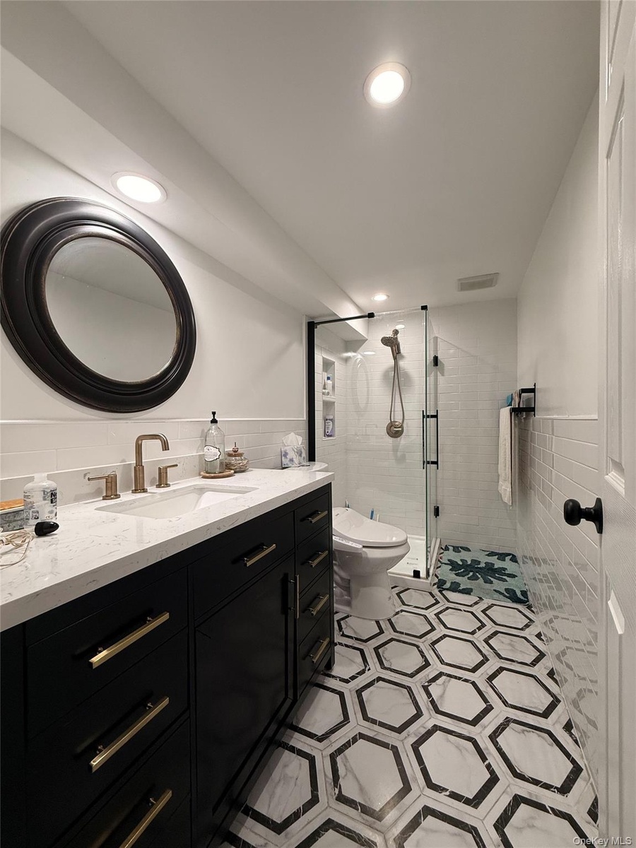 - Full bath with vanity, a stall shower, tile walls, wainscoting, and recessed lighting