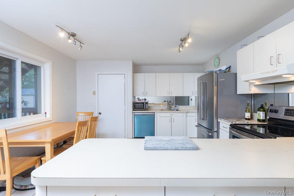 - Kitchen with light countertops, stainless steel appliances, white cabinets, and under cabinet range hood