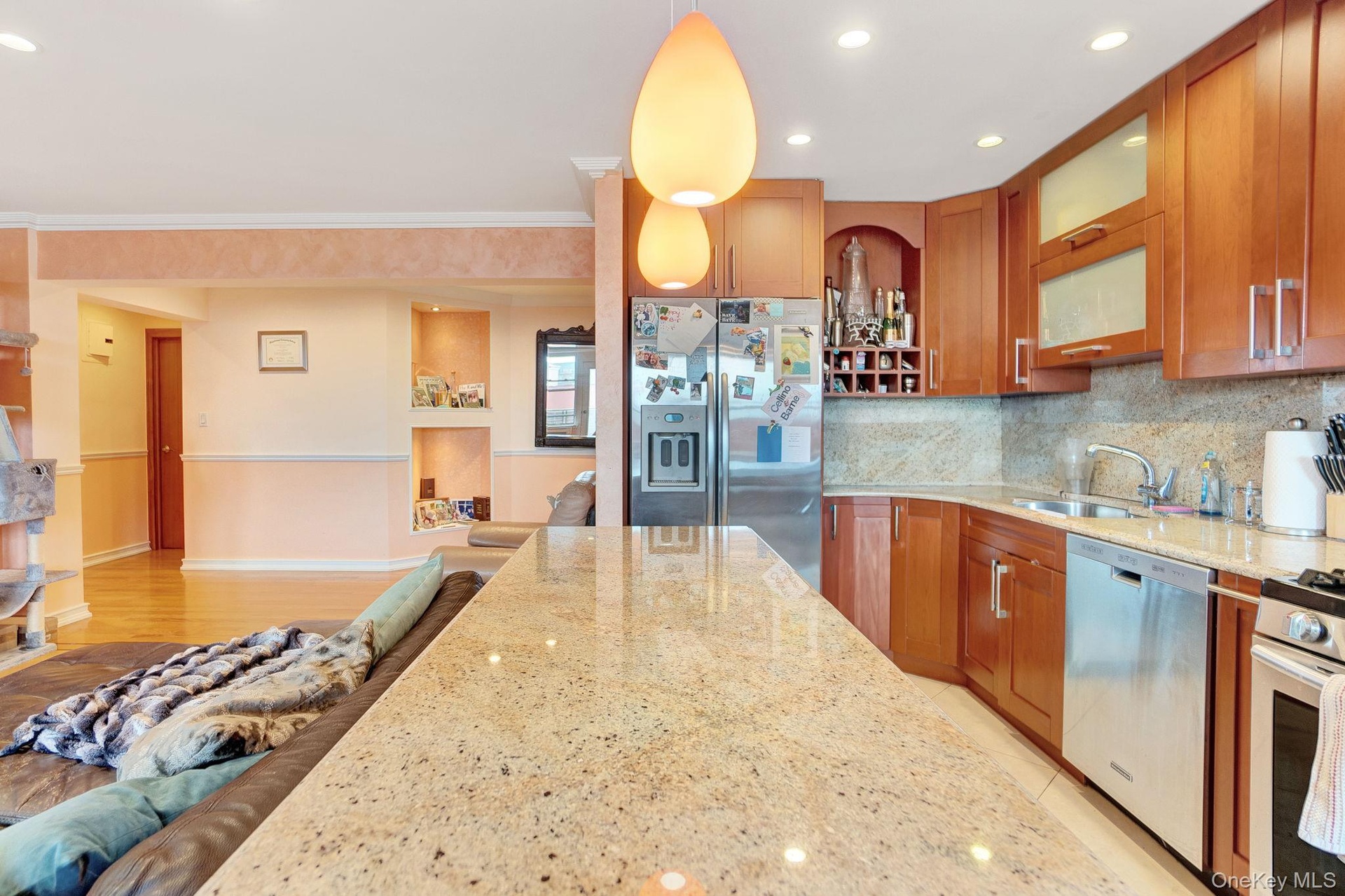 - Kitchen featuring decorative backsplash, appliances with stainless steel finishes, open floor plan, brown cabinetry, and recessed lighting
