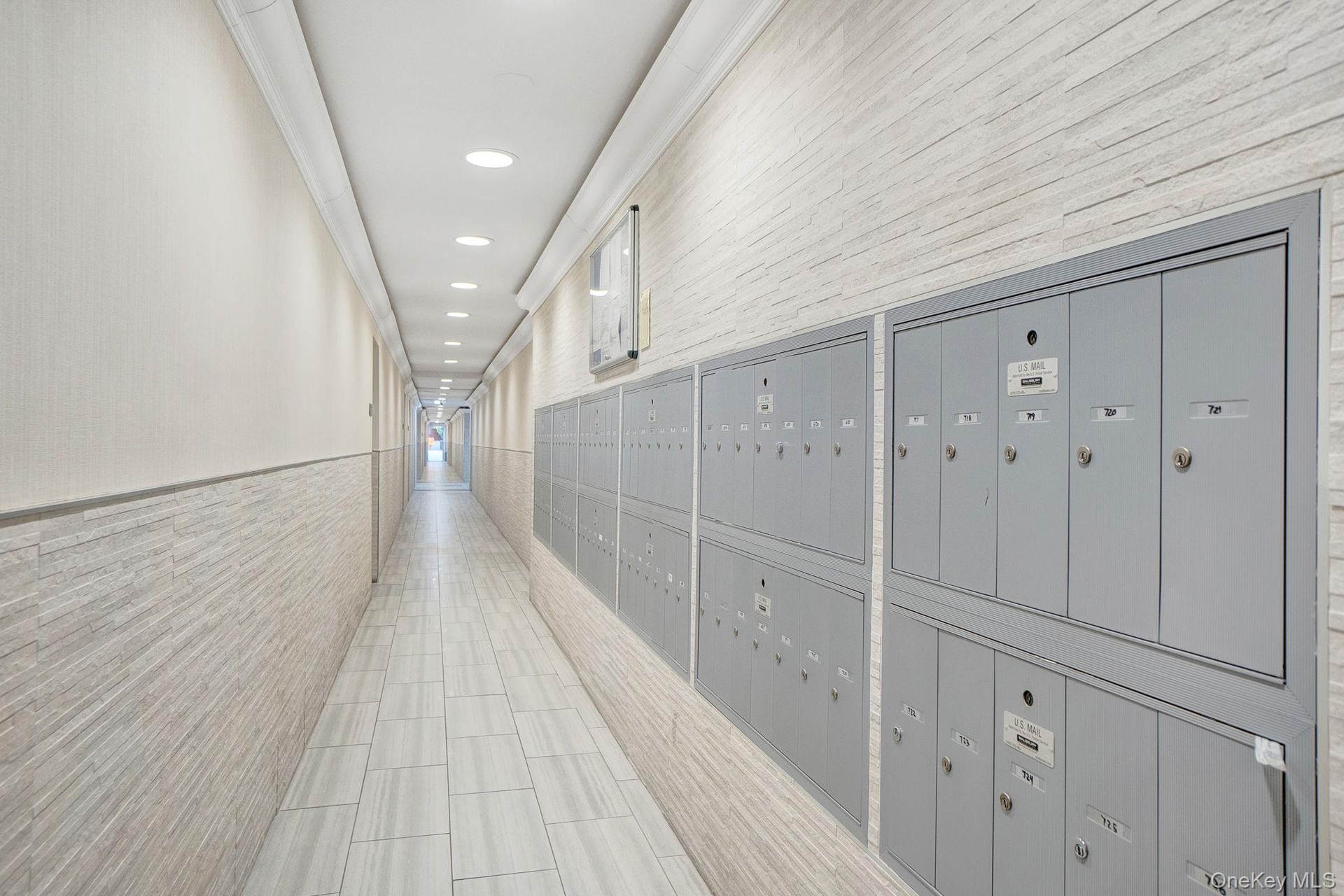 - Hall with mail area, a wainscoted wall, tile walls, recessed lighting, and light tile patterned floors