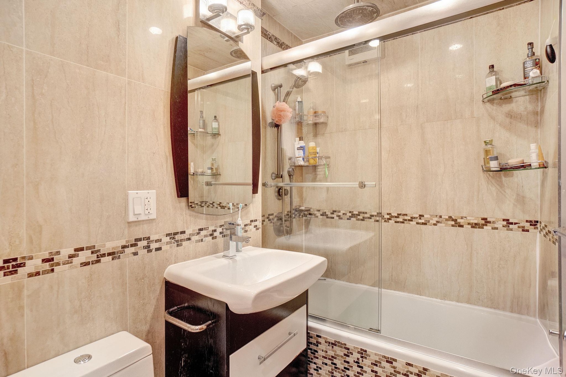 - Bathroom featuring tile walls, a combined bath / shower with rainfall shower, and vanity