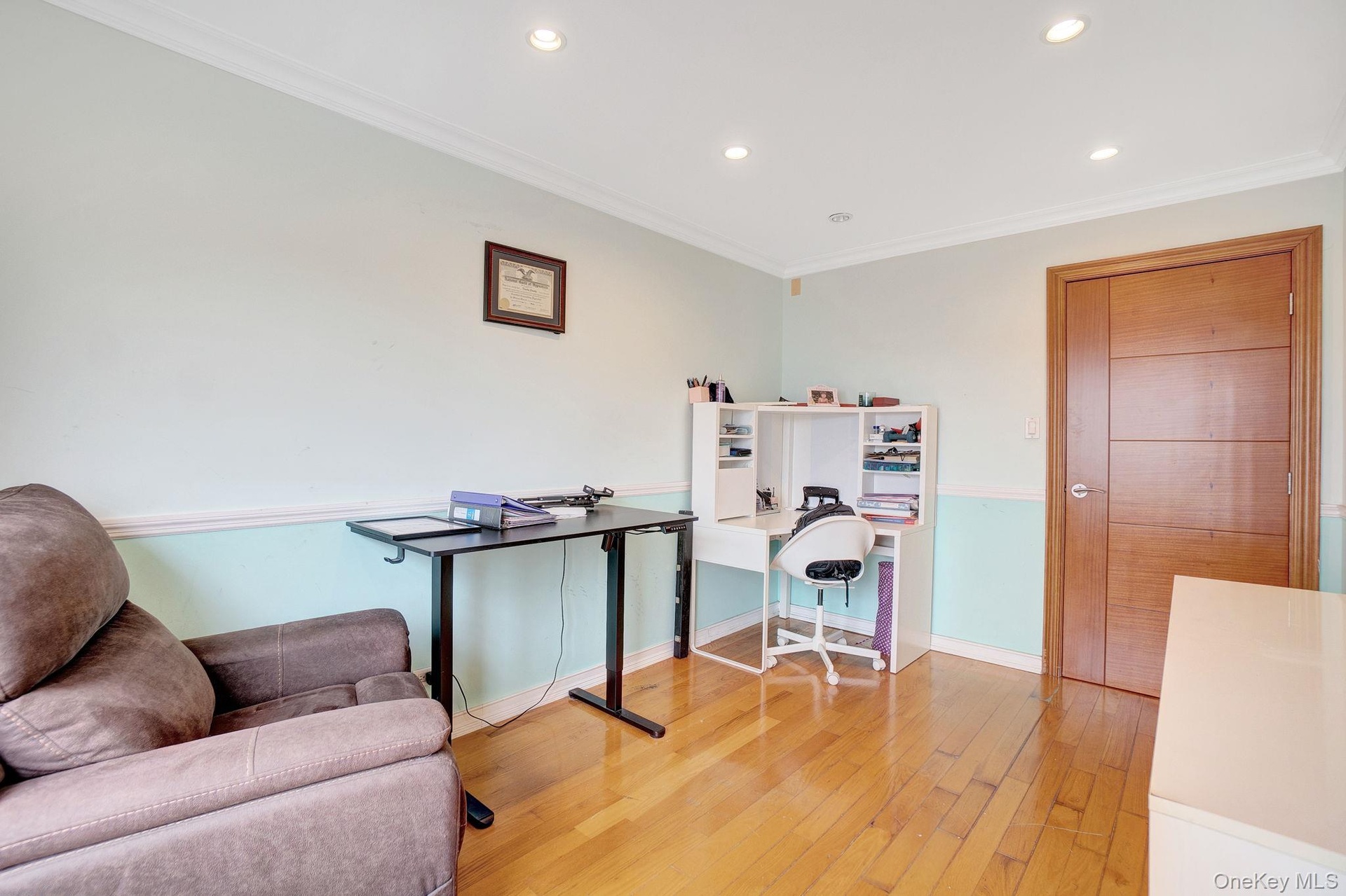 - Home office with ornamental molding, light wood finished floors, and recessed lighting