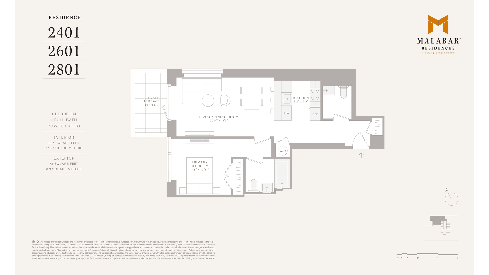 Residence 2401 is a one-bedroom, one-and-a-half-bath home that spans 837 square feet of interior space, complemented by a 72-square-foot loggia with western exposures inviting stunning sunsets and outdoor relaxation.