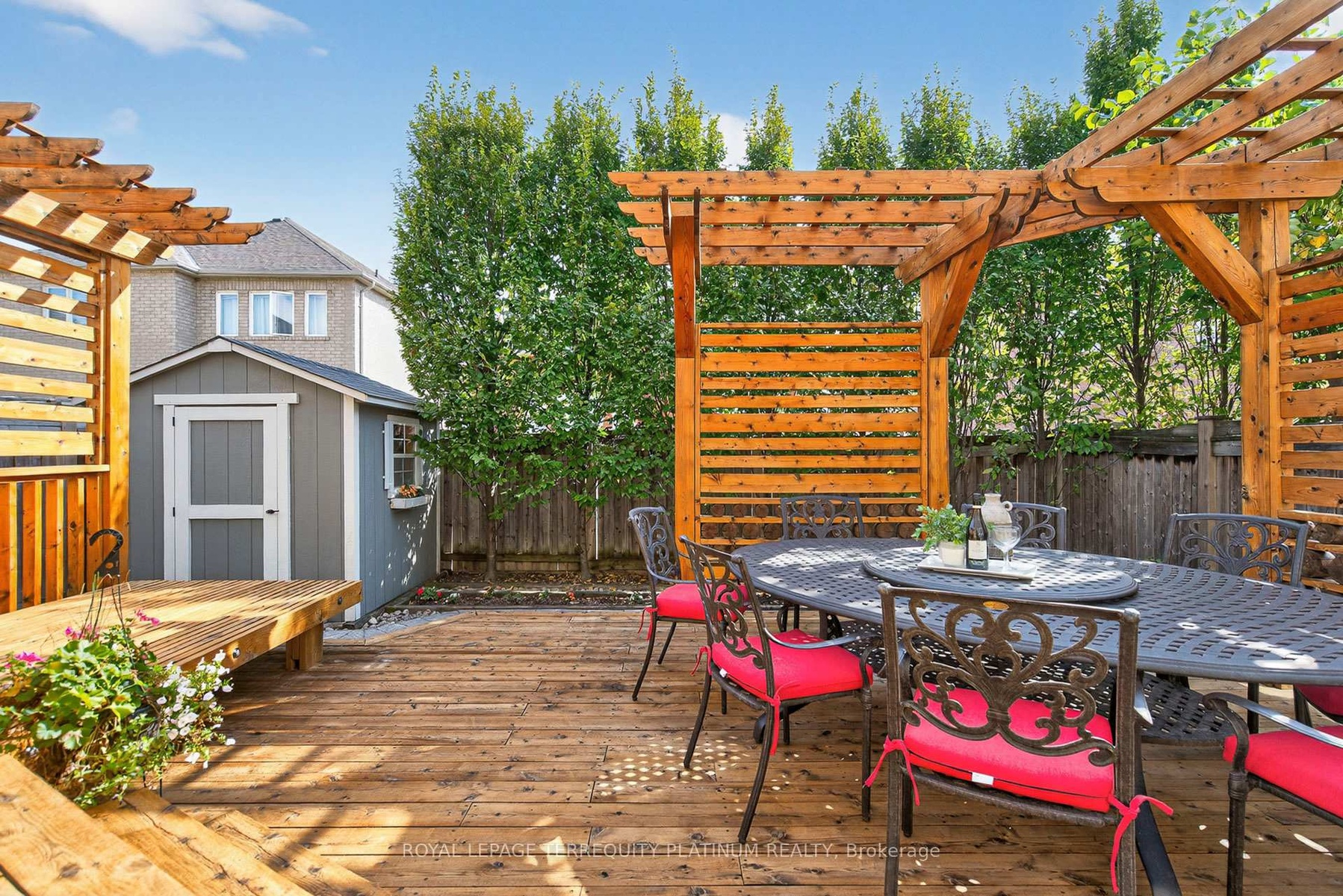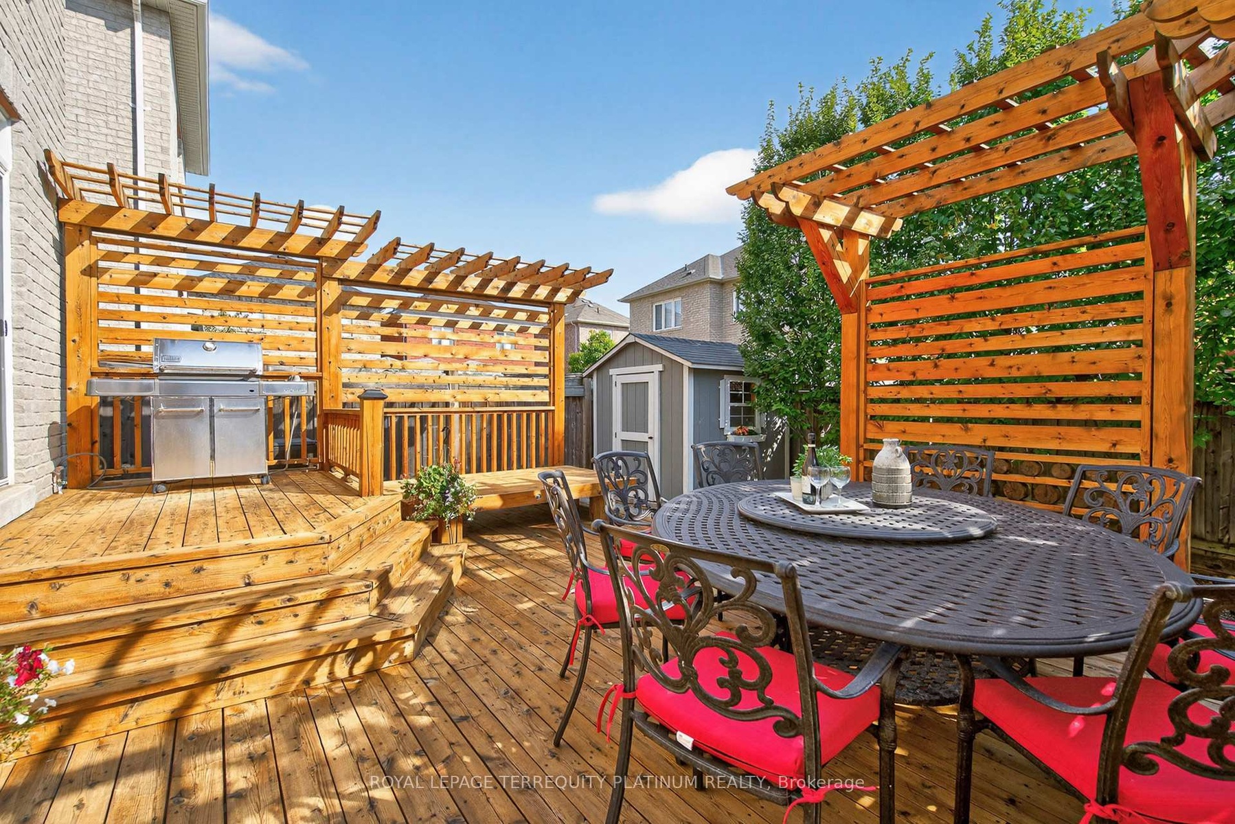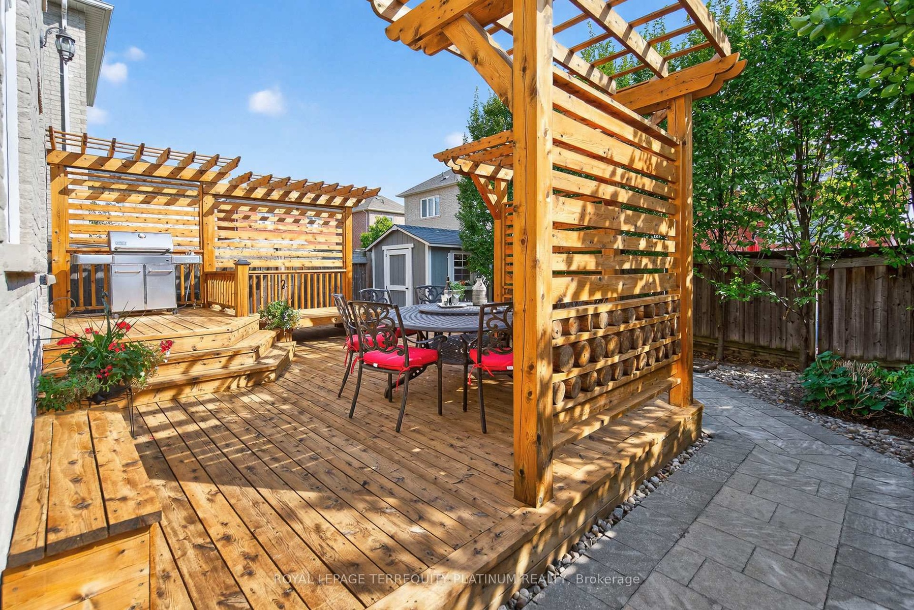 Look No Further! Perfectly situated on a quiet, low-traffic street, this residence showcases Citadel Charcoal Stonework, creating timeless curb appeal and an elegant first impression. Offering 2,580 sqft above grade plus over 1,000 sqft finished basement, which features a surround-sound system for movie nights, generous space for workout & hosting, a convenient wet bar & cabinet storage, and a guest bedroom for visitors. Forward-thinking upgrades include two EV charging outlets in the garage and hard wired network connectivity in every room, a must-have for professionals, students, and gamers alike. The 9 ft ceiling main floor highlights crown moulding, a recessed ceiling dining room, solid wood cabinetry, a kitchen island with breakfast bar, quartz counters and backsplash, and a striking art-deco style fireplace that adds warmth and character. Upstairs, four bedrooms and three bathrooms include two primary suites with spacious closets, while each bathroom is equipped with an electrical outlet beside the toilet for convenient bidet installation. Smooth Ceiling Throughout! The sun-filled, south-facing backyard is a private retreat framed by European hornbeam trees, custom pergolas, and a deck large enough for an eight-seat dining set and lounge. Interlock walkways, a wood shed, and low-maintenance flower beds complete the outdoor space. Within short walking distance to two elementary schools, Richmond Green Park, and community sports facilities, this home offers both lifestyle and convenience. Hwy 404 and major retailers including Costco, Home Depot, Staples, and grocery stores are only minutes away. With upscale finishes, abundant space, and technology upgrades, it delivers exceptional living in one of Richmond Hills most sought-after neighborhoods.