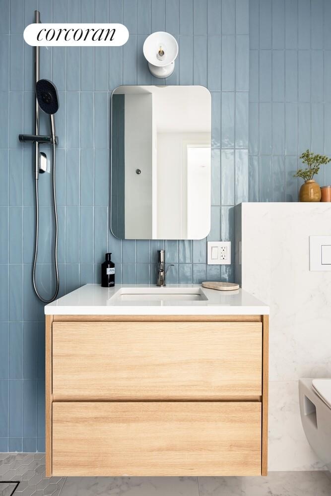 An architecturally compelling minimalist plaster staircase with a slim-lined oak banister guides you up to the mezzanine level where a modern bay window frames your second living room and allows light to flood in all day. Survey the entire main level from this birds-eye vantage point, and enjoy a cozy window seat at the end of a long day. The next flight up is a primary suite of epic proportions. A spacious bedroom with custom RBW lighting flows into an incredible dressing room, just ready and waiting for you to fill with all your fashion delights. The stylish bathroom includes a large walk-in shower, separate toilet room, double sink, large vanity with great drawer space, and is all outfitted in luxurious honed Calacatta Gold stone. A second bedroom on this floor is equally spacious and includes a great closet. The top floor offers two additional spacious bedrooms, one with an ensuite bath. The second bathroom is hallway accessible, includes a tub, and both enjoy a laid back minimal yet sophisticated palette of blue ceramic Heath tile and Calacatta marble stone. A convenient laundry room is also located on this floor.