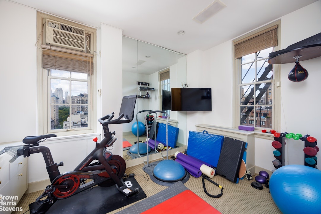 The bedroom wing is equally generous. The double-sized primary suite is bathed in Southern light and includes four large closets and a windowed en-suite bath. The corner second bedroom enjoys South and West exposures with a walk-in closet and an en-suite windowed bath. The third bedroom is off of the living room with views over Park Avenue and is perfectly suited either as a library or guest suite. The fourth bedroom, currently configured as a home gym, has West and North exposures, its own full bathroom, and a washer/dryer.