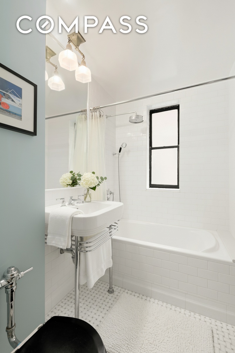 The corner bedroom is a private sanctuary, framed by four windows that welcome sun and sky from multiple exposures. With a generous closet and ample space for a home office, it blends functionality and retreat-like tranquility. The renovated bath pays homage to the building’s period character while offering contemporary comfort, finished with classic subway tile, marble floors, and top-tier Lefroy Brooks fixtures and fittings.