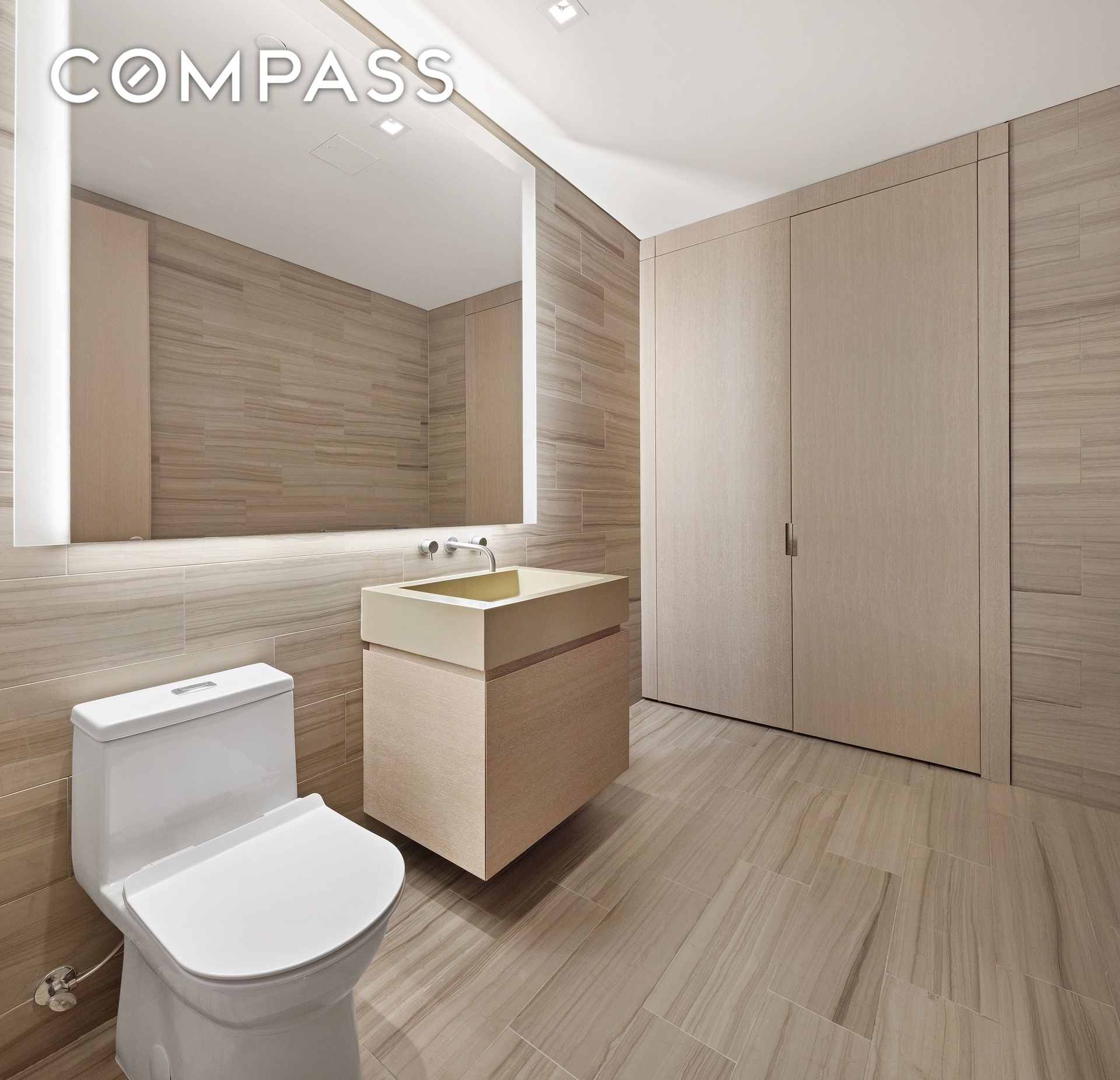 The versatile study functions as a guest room or home office, complete with two custom-fitted closets. The adjacent powder room is finished in tan marble with a floating vanity, custom cabinetry, and backlit mirror. Additional conveniences include a full-sized in-unit washer/dryer.