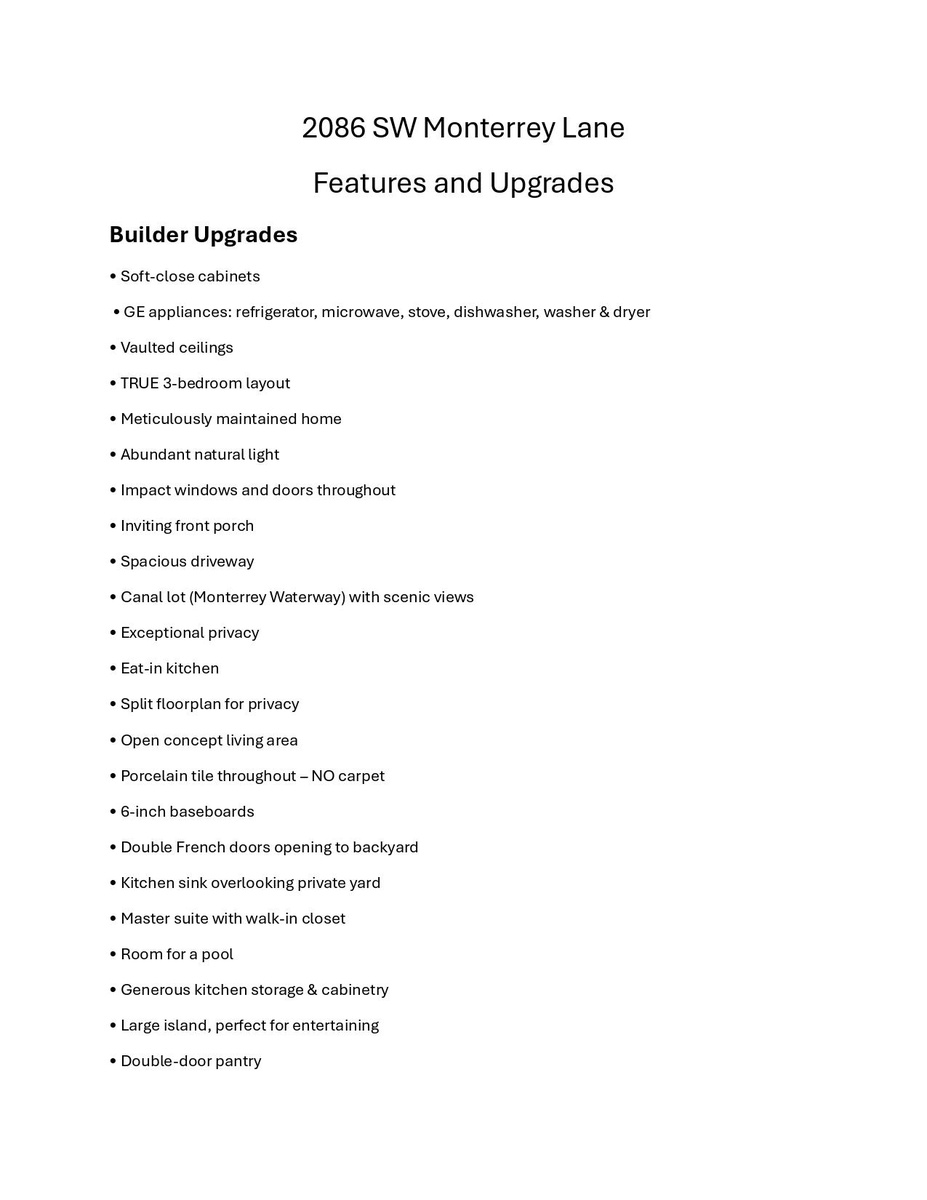 TRUE 3BD 2 BA home CBS Smart Home built in 2020 with NO HOA on a private canal lot with space for a pool! Conveniently located close to all things to do: Tradition Town Square and events, Golf Courses, St. Lucie West, beautiful South FL beaches and I-95 highway access/Turnpike. This home is LIKE NEW with IMPACT throughout, porcelain tile throughout (NO carpet), plantation shutters, extra light and so many more upgrades (see full list). The backyard space can be your private oasis with the screened in covered patio w/ epoxy flooring, fully fenced in yard and trees/plant variety with space for more (Mexican oregano, guanabana, strangler fig, rosemary bush, sweet almond bush, 2 mahogany trees, lime tree, etc.). The Kitchen features a large island, double door pantry and plenty of storage