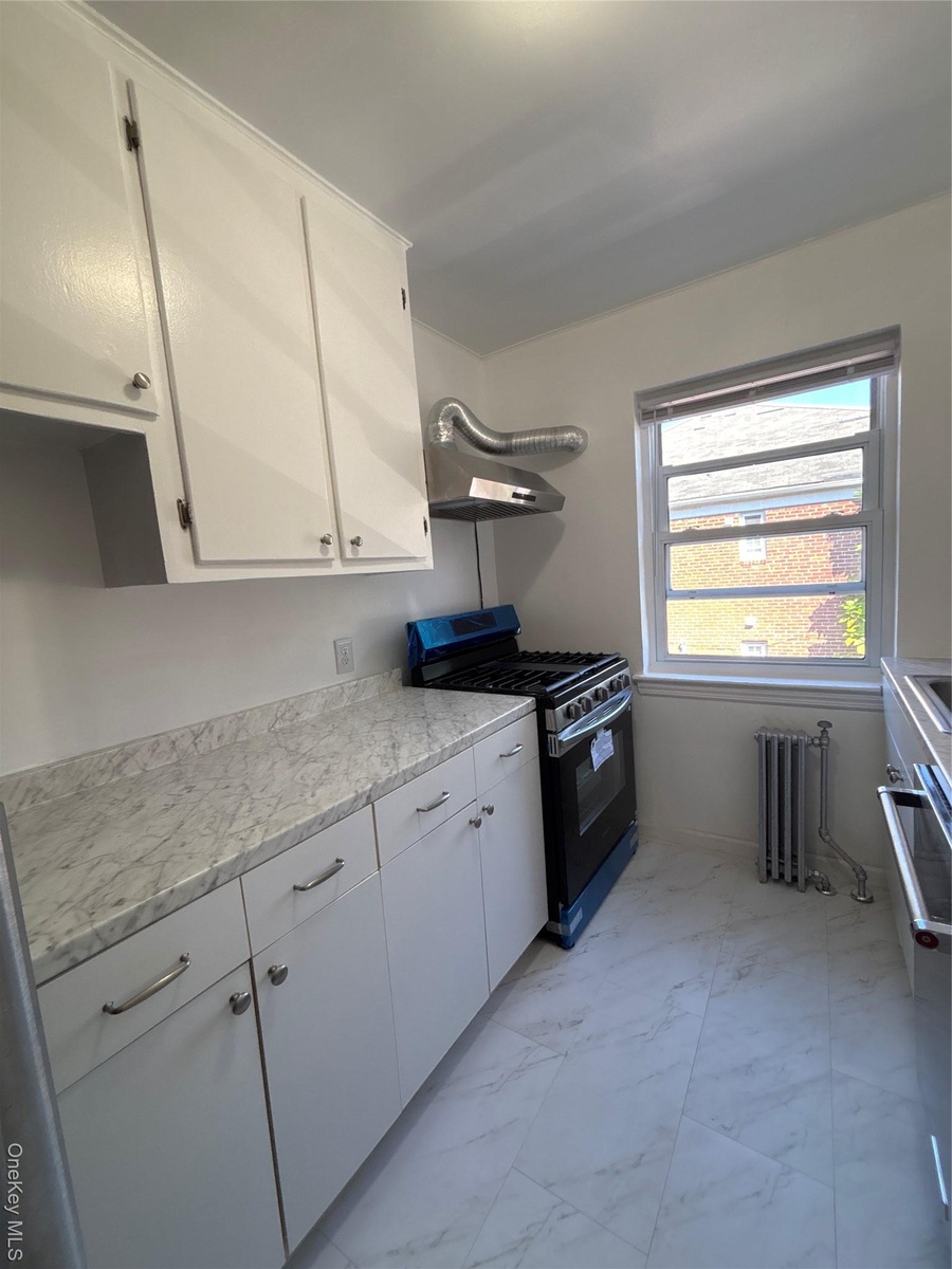 - Kitchen with range, white cabinets, light marble finish floors, and radiator heating unit