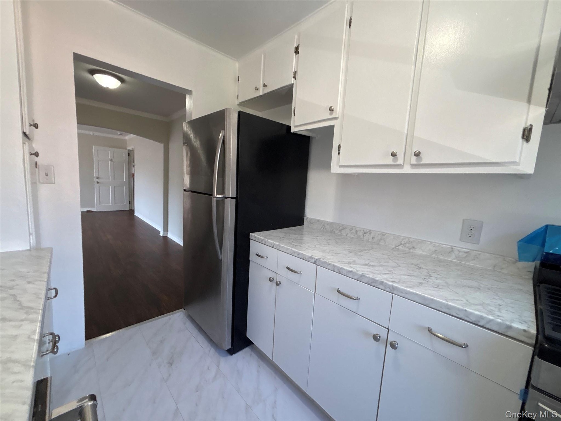 - Kitchen with light countertops, white cabinets, freestanding refrigerator, ornamental molding, and light marble finish floors