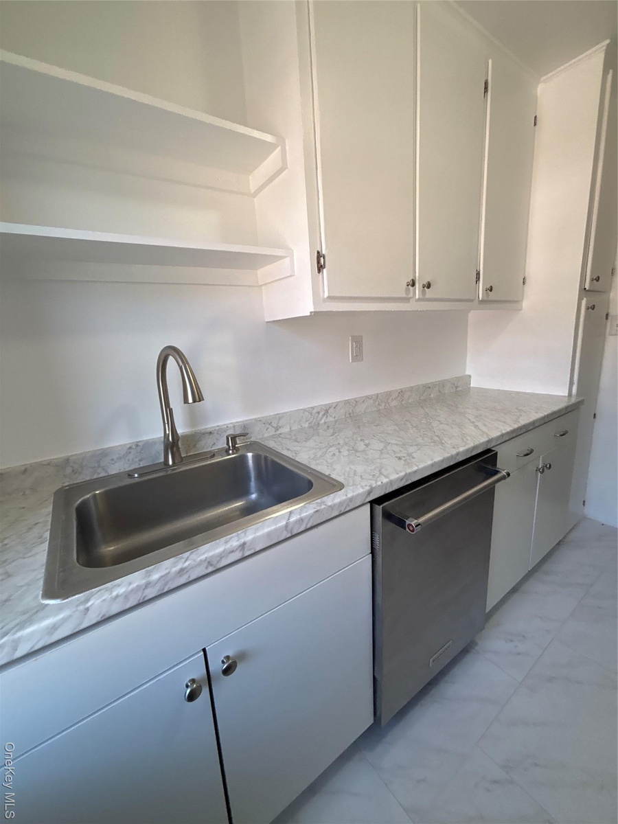 - Kitchen featuring open shelves, light countertops, light marble finish flooring, stainless steel dishwasher, and white cabinetry