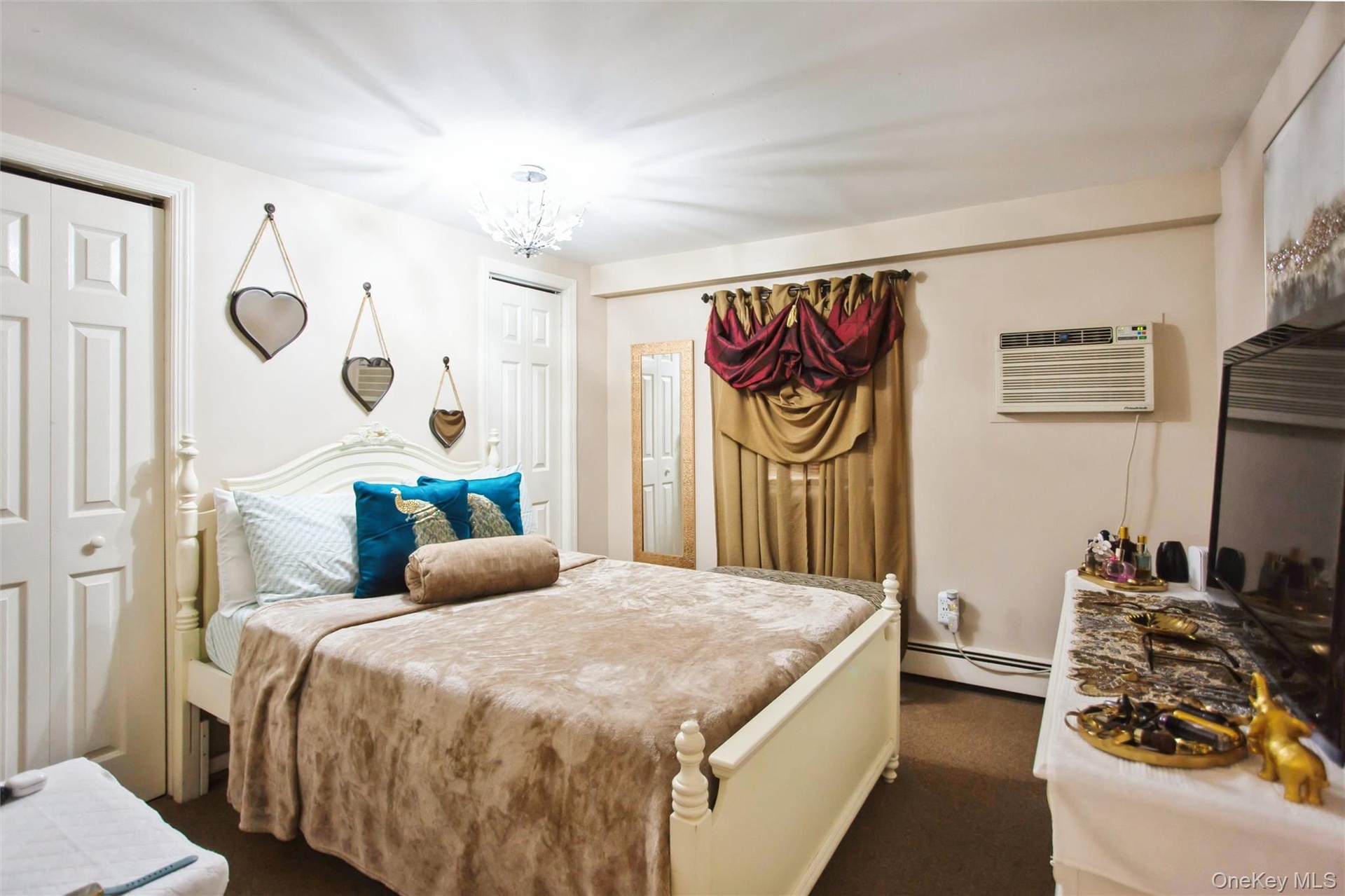 - Bedroom with two closets, a baseboard heating unit, dark carpet, a wall unit AC, and a chandelier